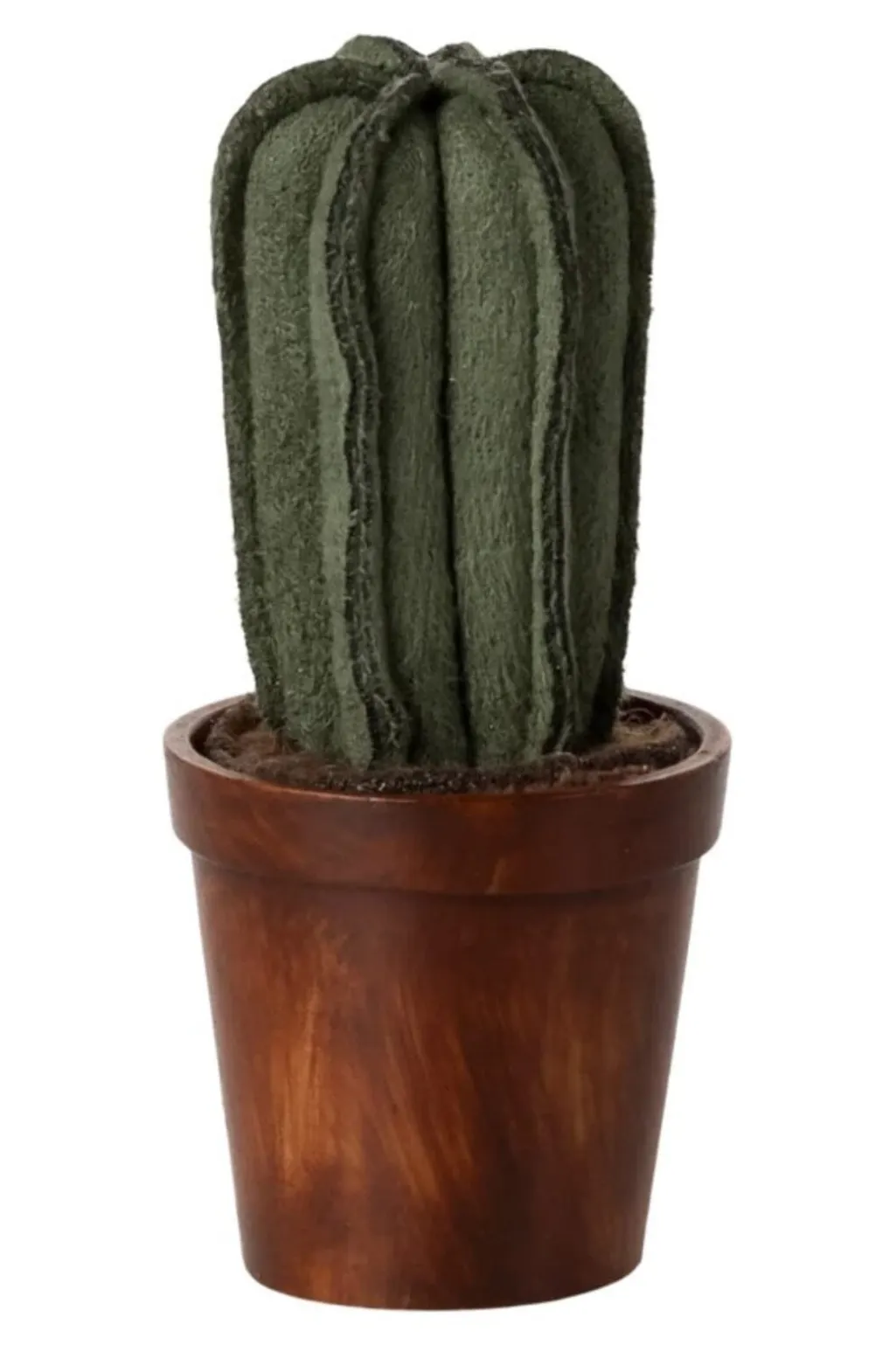 Grøn kaktus fra Maileg med blød, struktureret overflade. Den runde top og ribberne giver et naturtro udseende. Leveres i brun potte med stofjord.