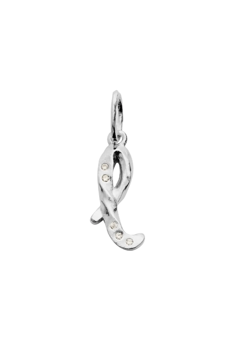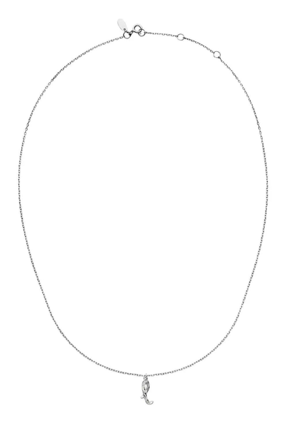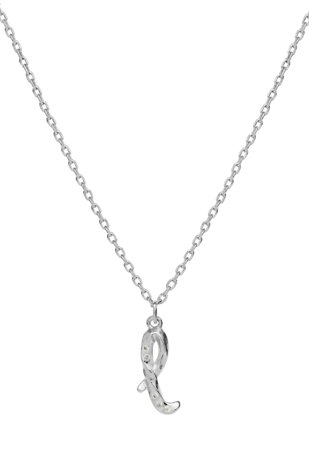 Sølvhalskæde fra Maanesten med et bølget L-bogstav som vedhæng. Vedhænget har små sten indlagt i designet, hvilket giver et personligt præg.