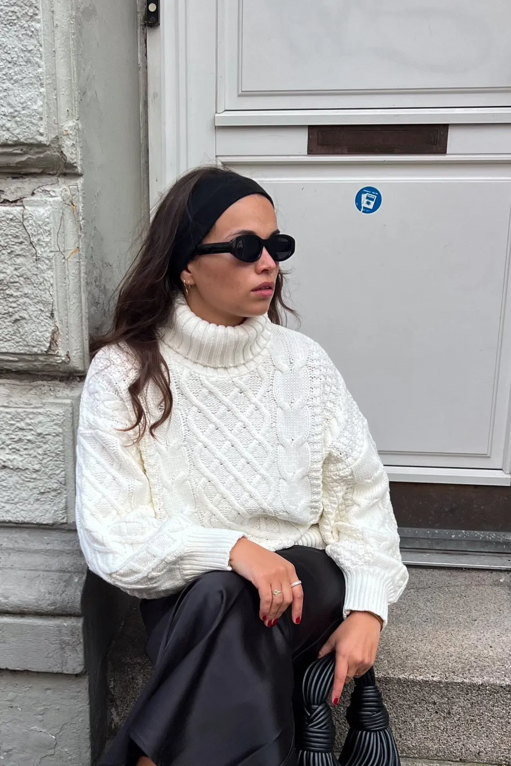 En off-white striktrøje fra Noella med kabelstrikdetaljer på forsiden. Trøjen har en høj rullekrave og lange ærmer med flettemønster.