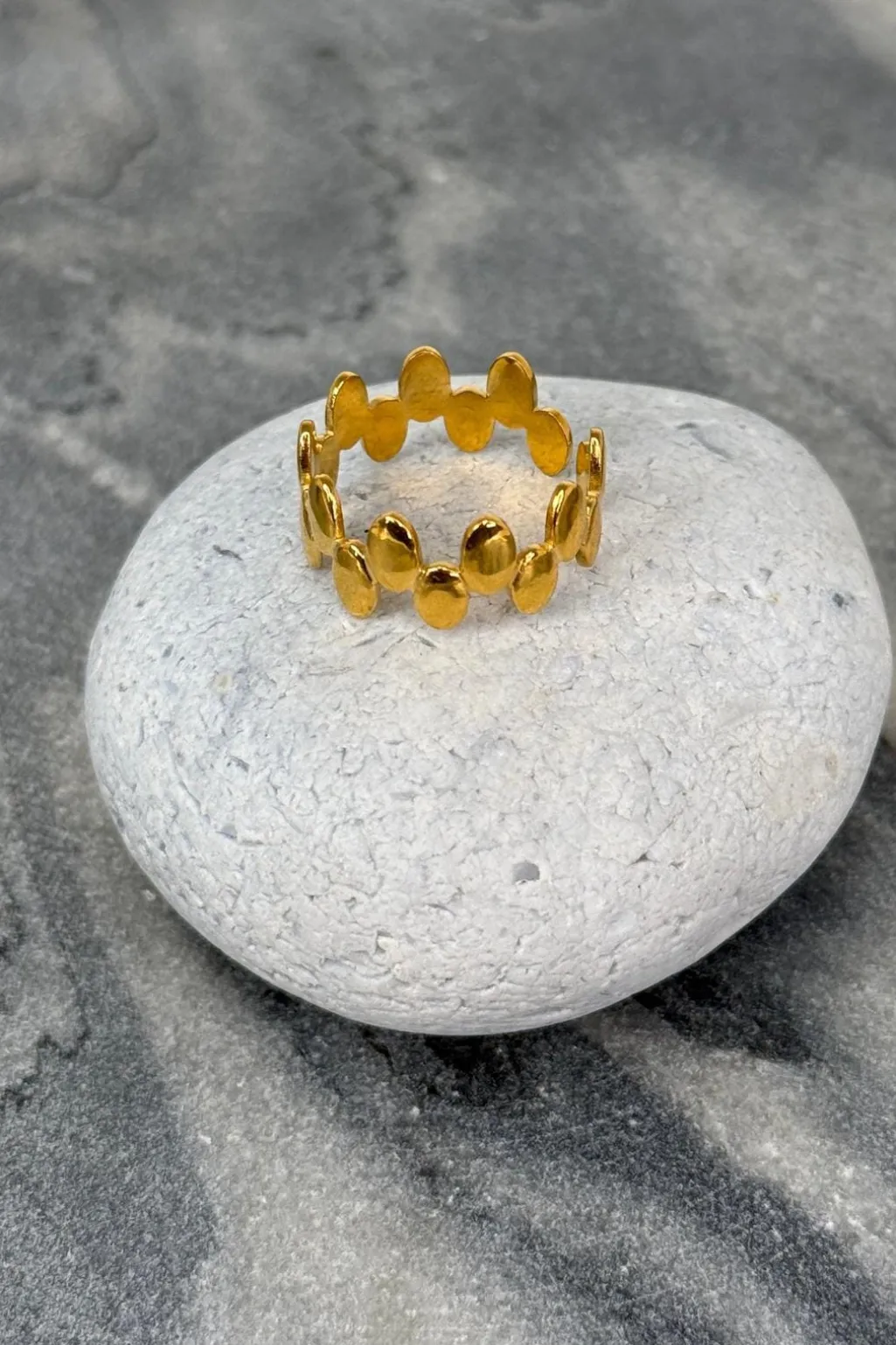 Forgyldt ring fra Mellow Moon med ovale former i Lærke-designet. De afrundede elementer skaber en sammenhængende kæde rundt om fingeren.