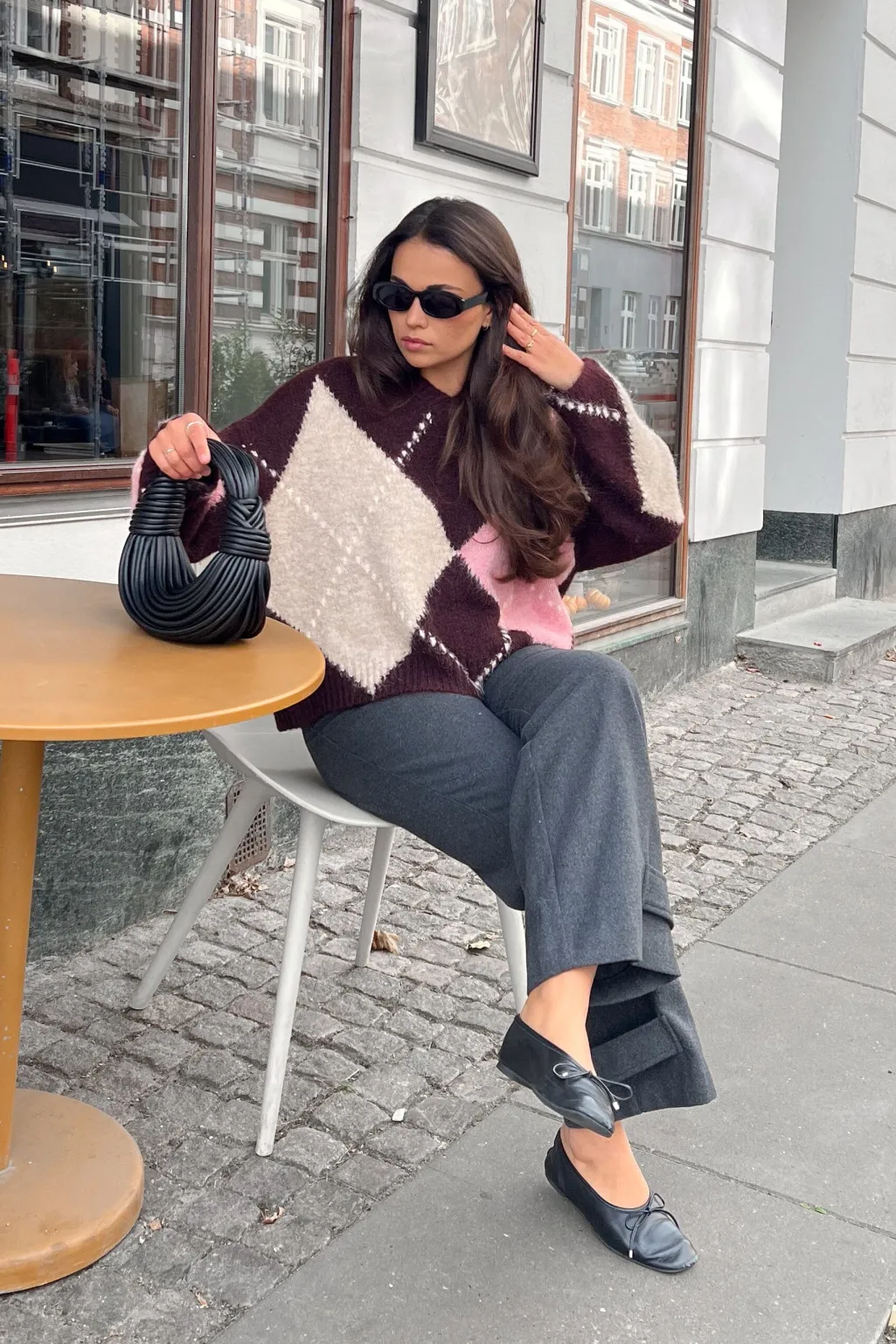 Striktrøje fra Noella med et stort argyle-mønster i vinrøde, lyserøde og beige nuancer. Trøjen har ribbede kanter og en afslappet pasform.
