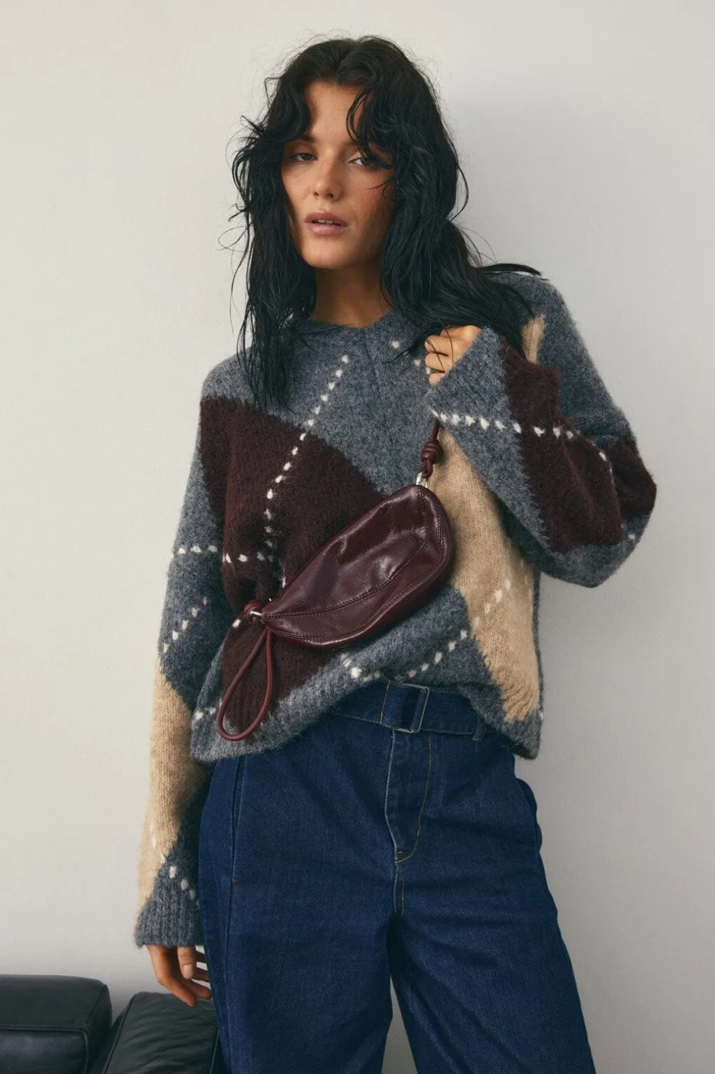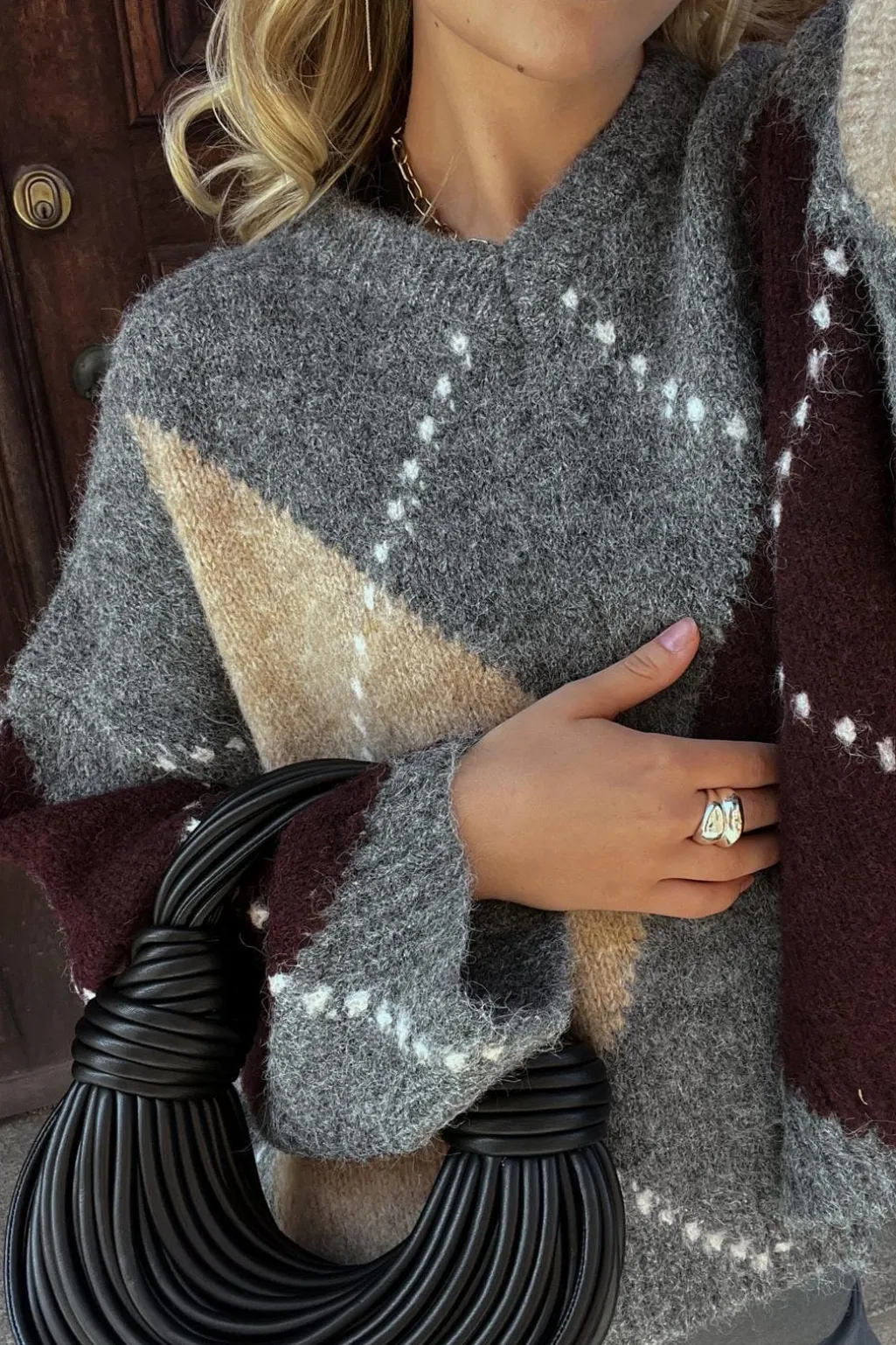 En grå strik fra Noella med et oversized design og lange ærmer. Strikken har et argyle-mønster i grå, beige og bordeaux farver.