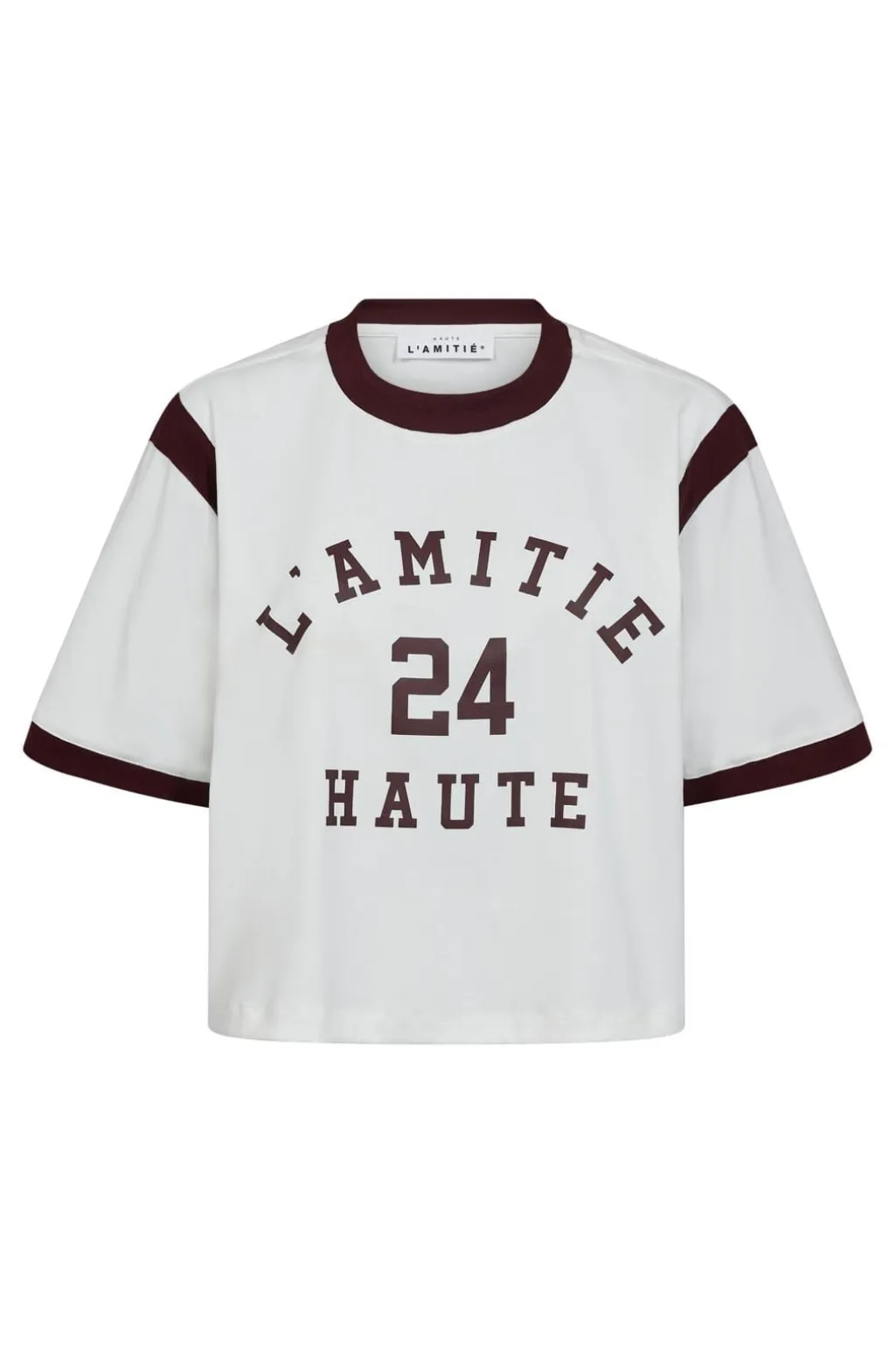 En løs t-shirt fra Haute L’Amitié i hvid med mørkerøde kantdetaljer. Printet L’AMITIÉ 24 HAUTE på forsiden giver den et sporty udtryk.