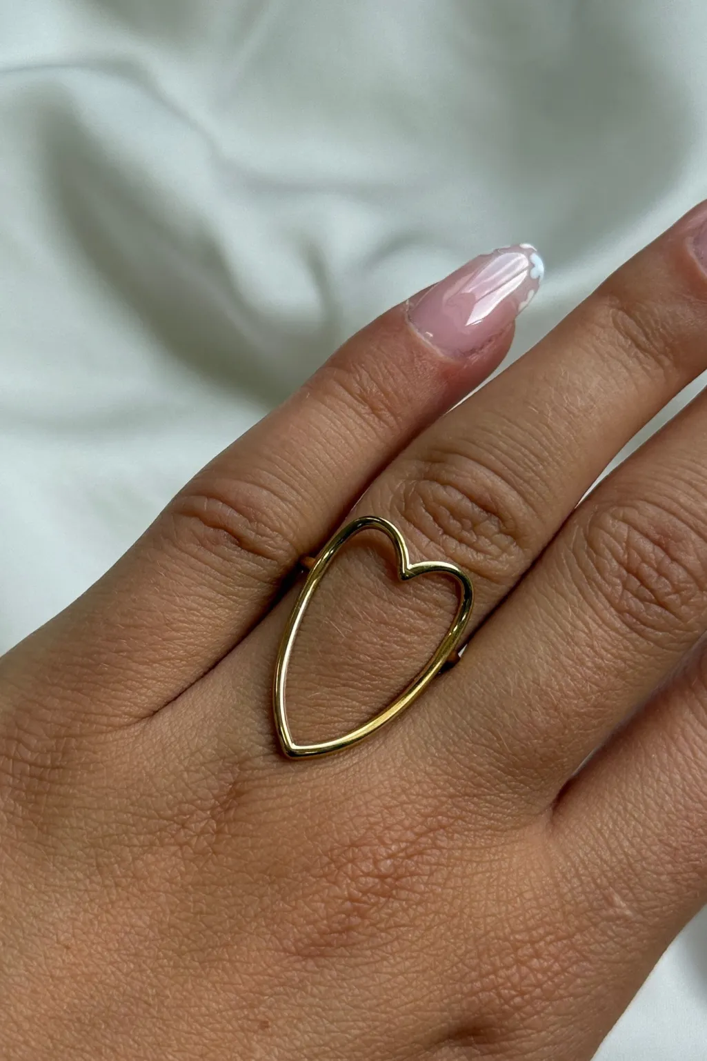 Forgyldt ring fra Mellow Moon med åbent hjerte-design. Ringen har en højde på 20 mm og er fremstillet i rustfrit stål med en gylden finish.