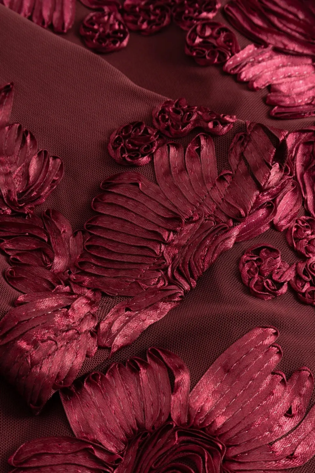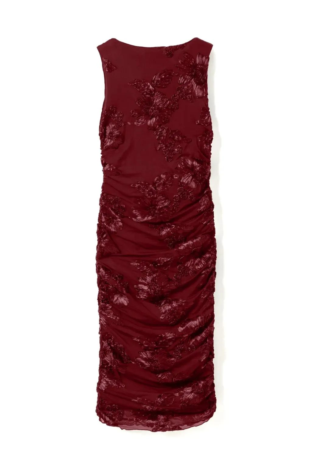 Vinrød kjole fra Noella med blomsterbroderi og rynkeeffekt. Den har høj halsudskæring, ærmeløst design og når til midt på læggen.
