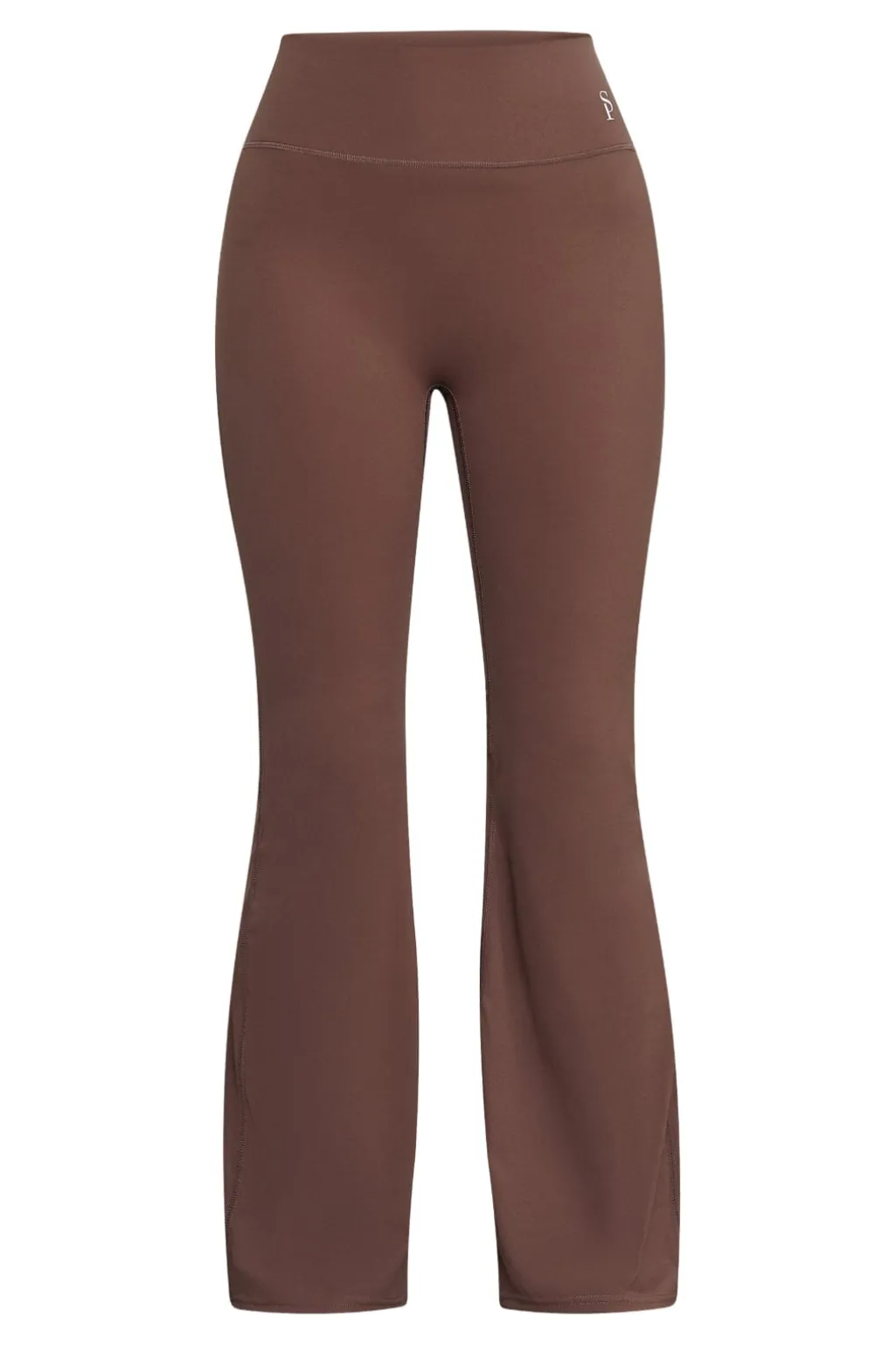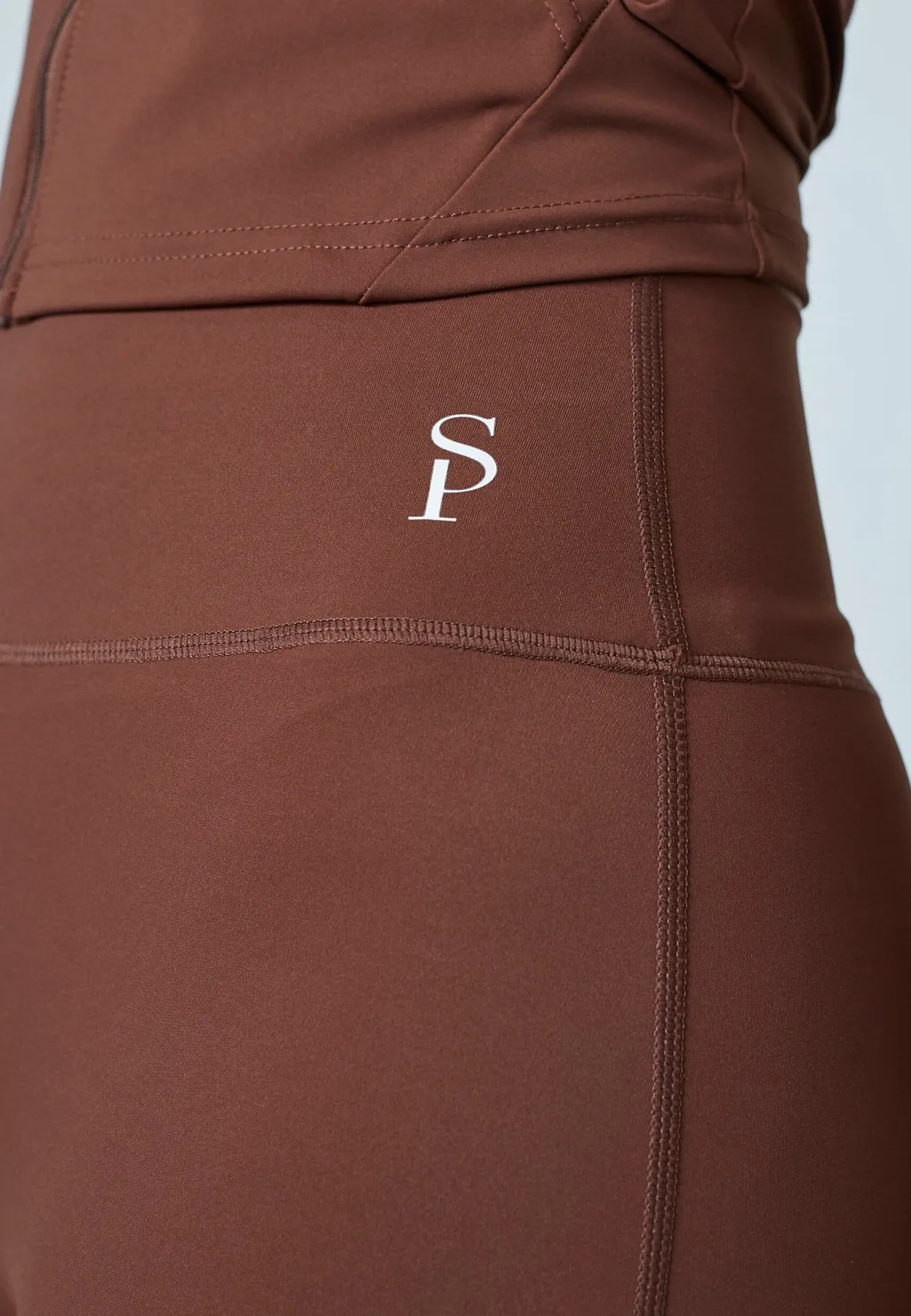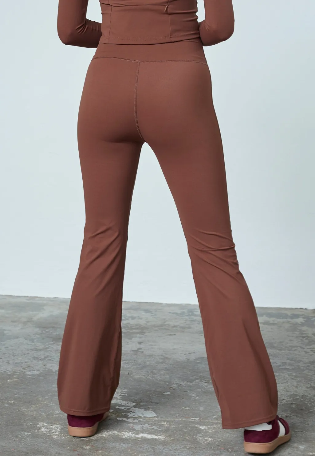 Brune bukser fra Sisters Point med en tætsiddende pasform og gulvlængde. Bukserne har høj talje og er lavet af et elastisk materiale.