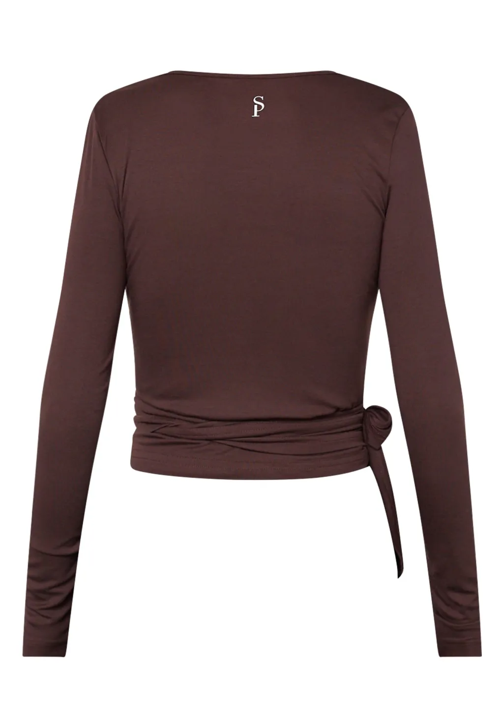 Omlotbluse fra Sisters Point, lavet af modal og elastan i en dyb brun nuance. Blusen har et omlotsnit med dyb v-udskæring.