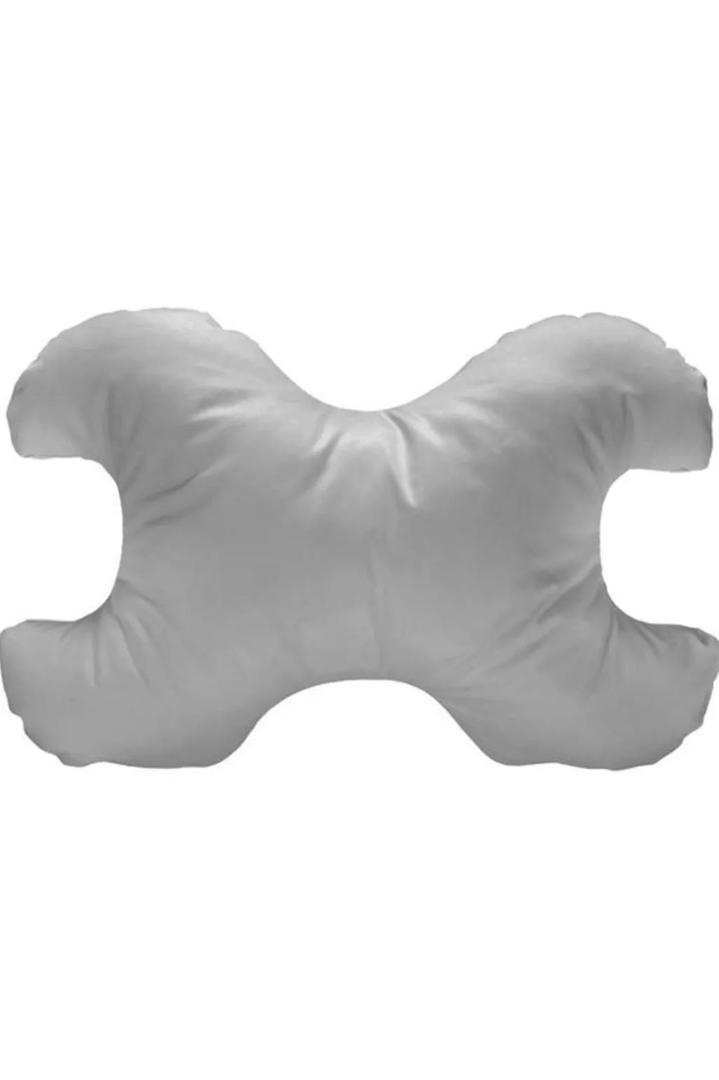 Grå pude med patenteret timeglasform fra Save My Face. Den specielle udformning holder ansigtet frit under søvn, og det aftagelige betræk gør den nem at holde ren.