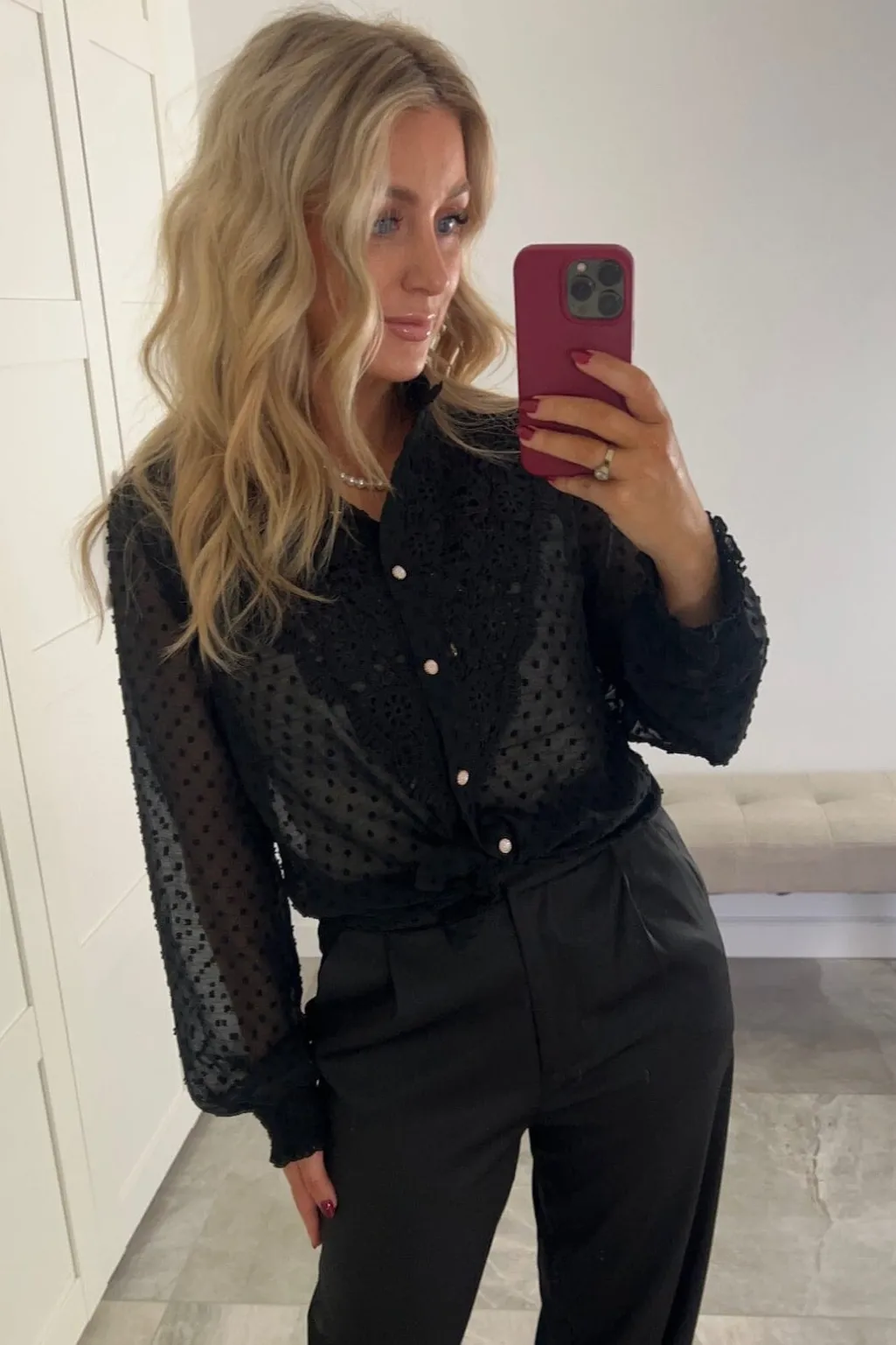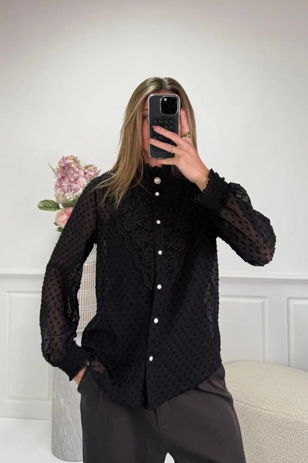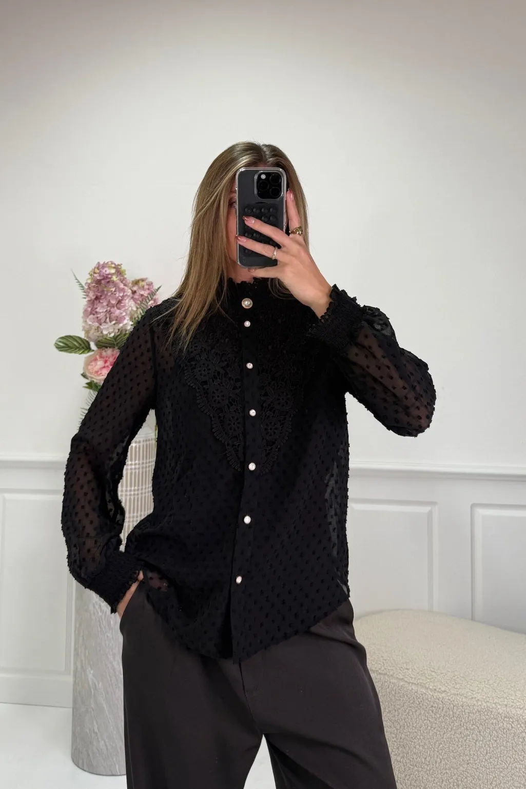 Sort bluse fra Dear Molly, lavet af vævet polyester. Blusen har dekorative blonder, perledetaljer og knaplukning langs fronten.