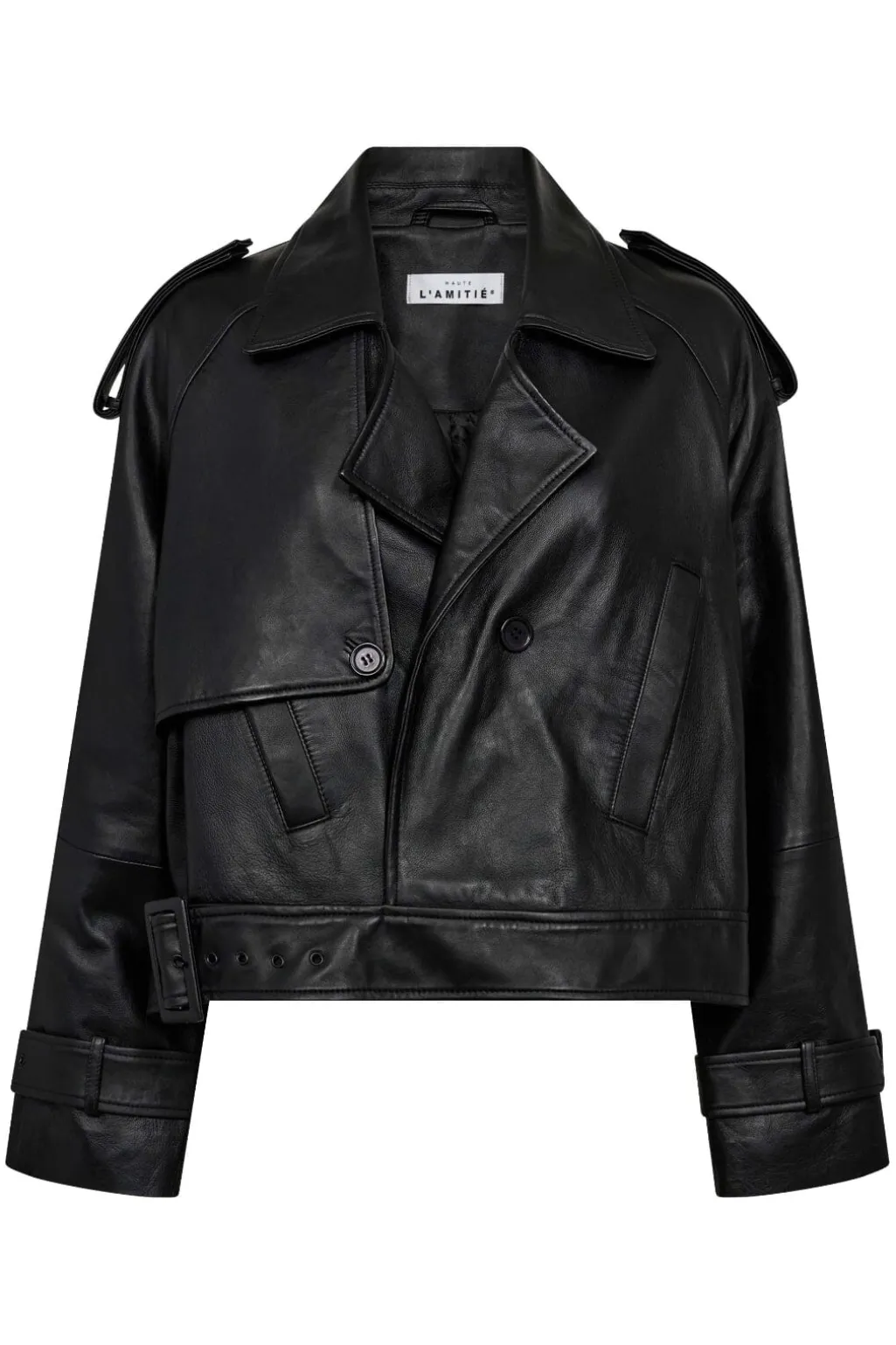 Sort læderjakke fra Haute L’Amitié i trenchcoat-stil. Jakken har en dobbeltradet front med knapper og et bælte i taljen.