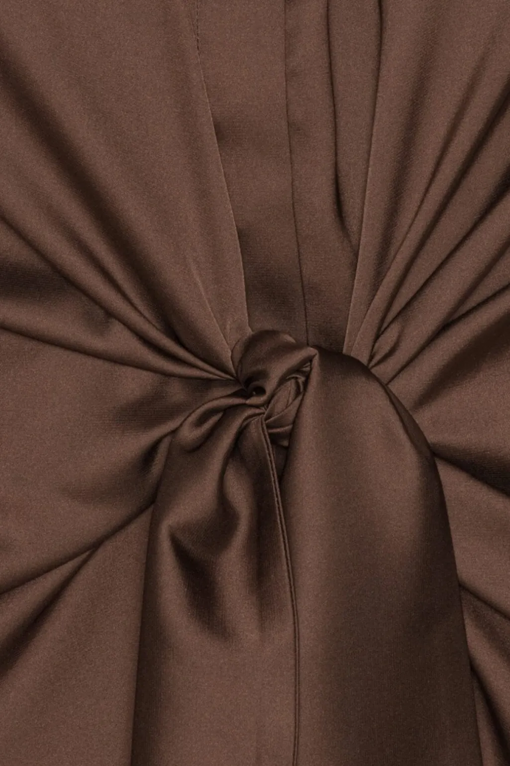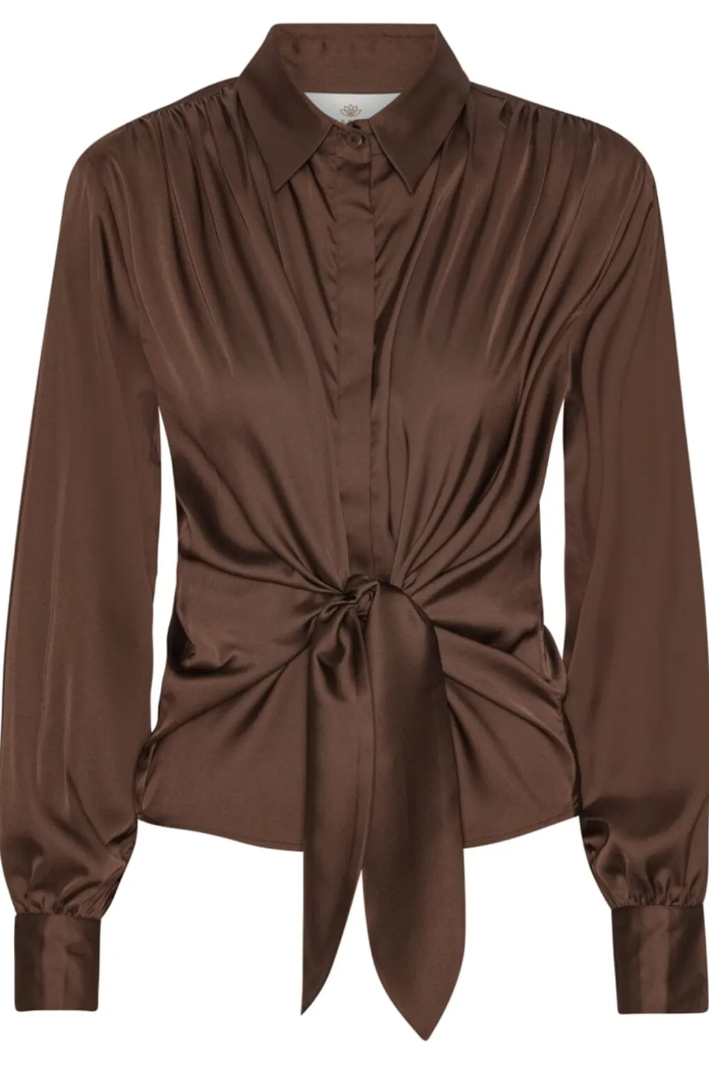 Brun skjorte fra Karmamia med skinnende overflade. Den har en klassisk skjortekrave og lange ærmer med bindebånd, der skaber et særligt udtryk.