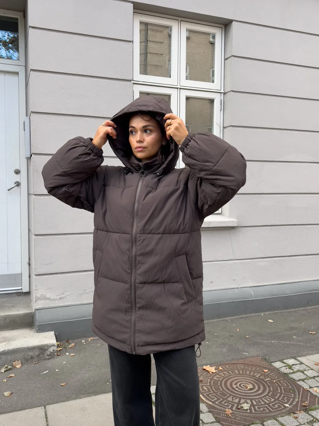 Quiltet pufferjakke fra Noella i en lysegrå nuance. Jakken har en hætte, frontlynlås og elastiske manchetter.