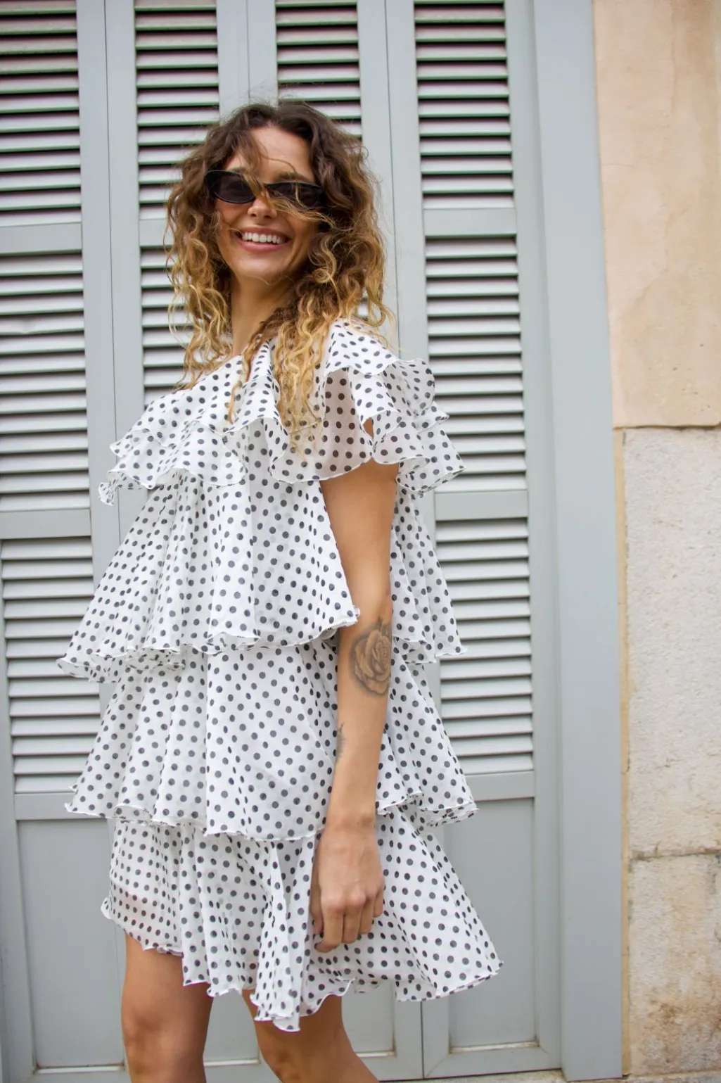 Hvid kjole fra Cras med sorte prikker. Den har en asymmetrisk en-skulderudskæring og lagdelte flæser fra top til bund. Kjolen går til midt på låret.