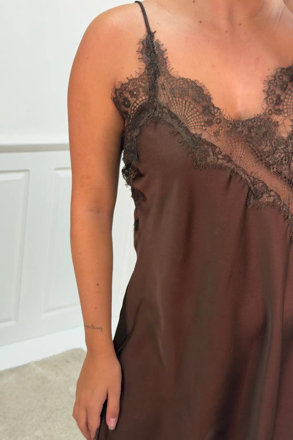 Mørkebrun kjole fra A-bee med asymmetrisk snit og blondedetaljer. Kjolen har en løs pasform og går til midt på læggen. V-udskæringen og de tynde stropper giver et let udtryk.