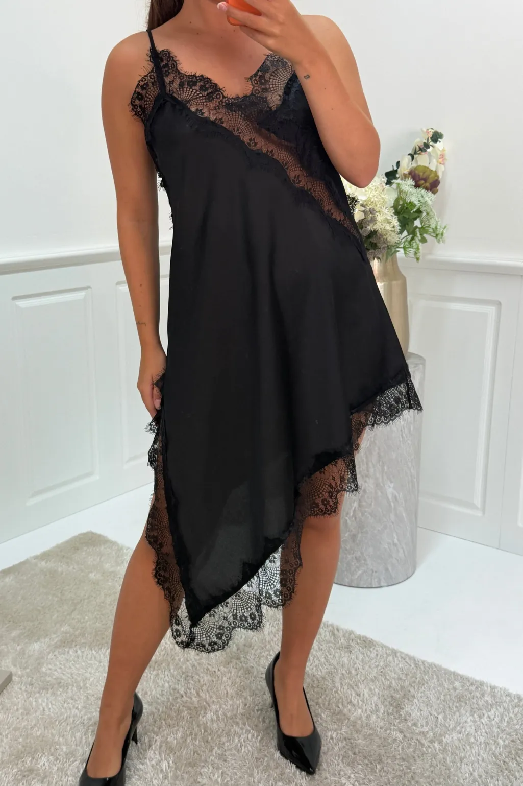Sort festkjole fra A-bee med V-hals og asymmetrisk kant. Kjolen har blonder detaljer langs halsudskæringen og kanten, som giver et fint udtryk til designet.