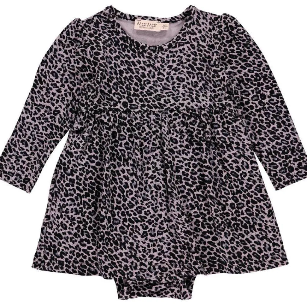 Langærmet bodykjole fra MarMar med grå leopardmønster og sort kontrast. Kjolen har flæsedetaljer og en bodydel nederst med elastisk lukning.