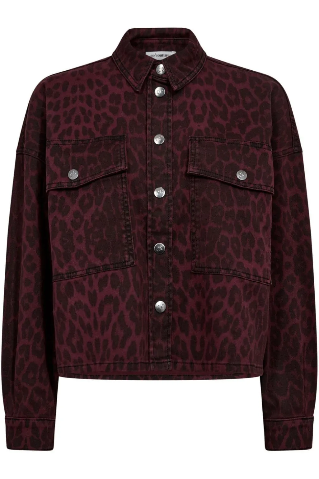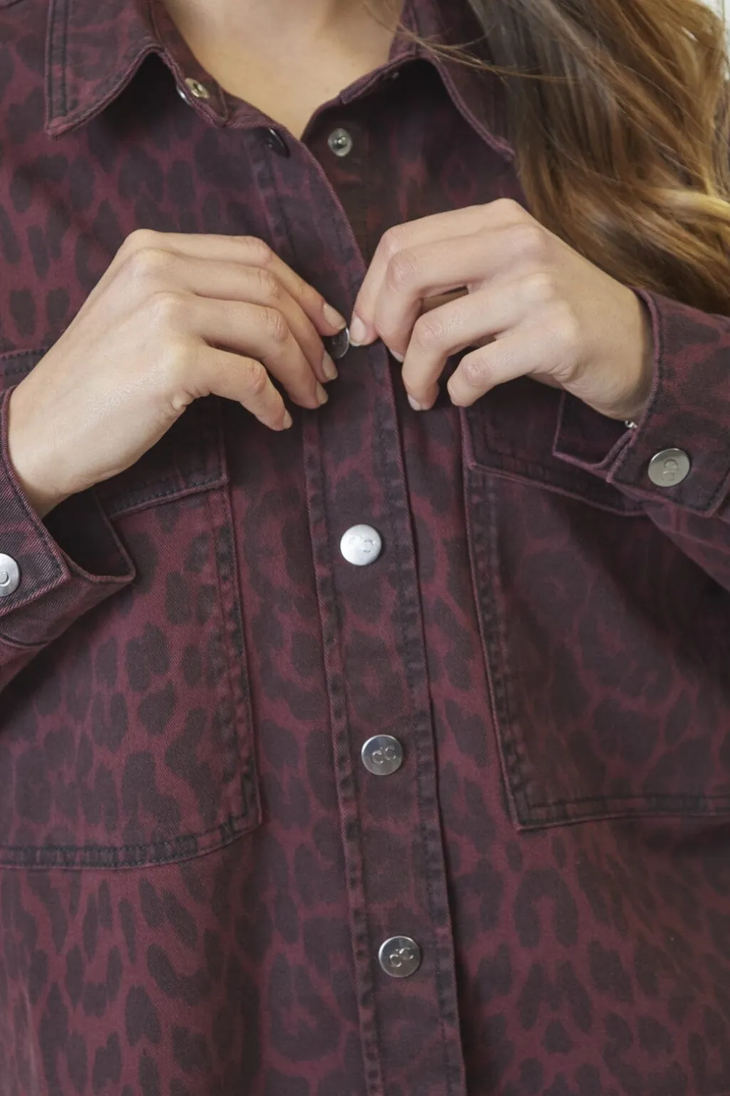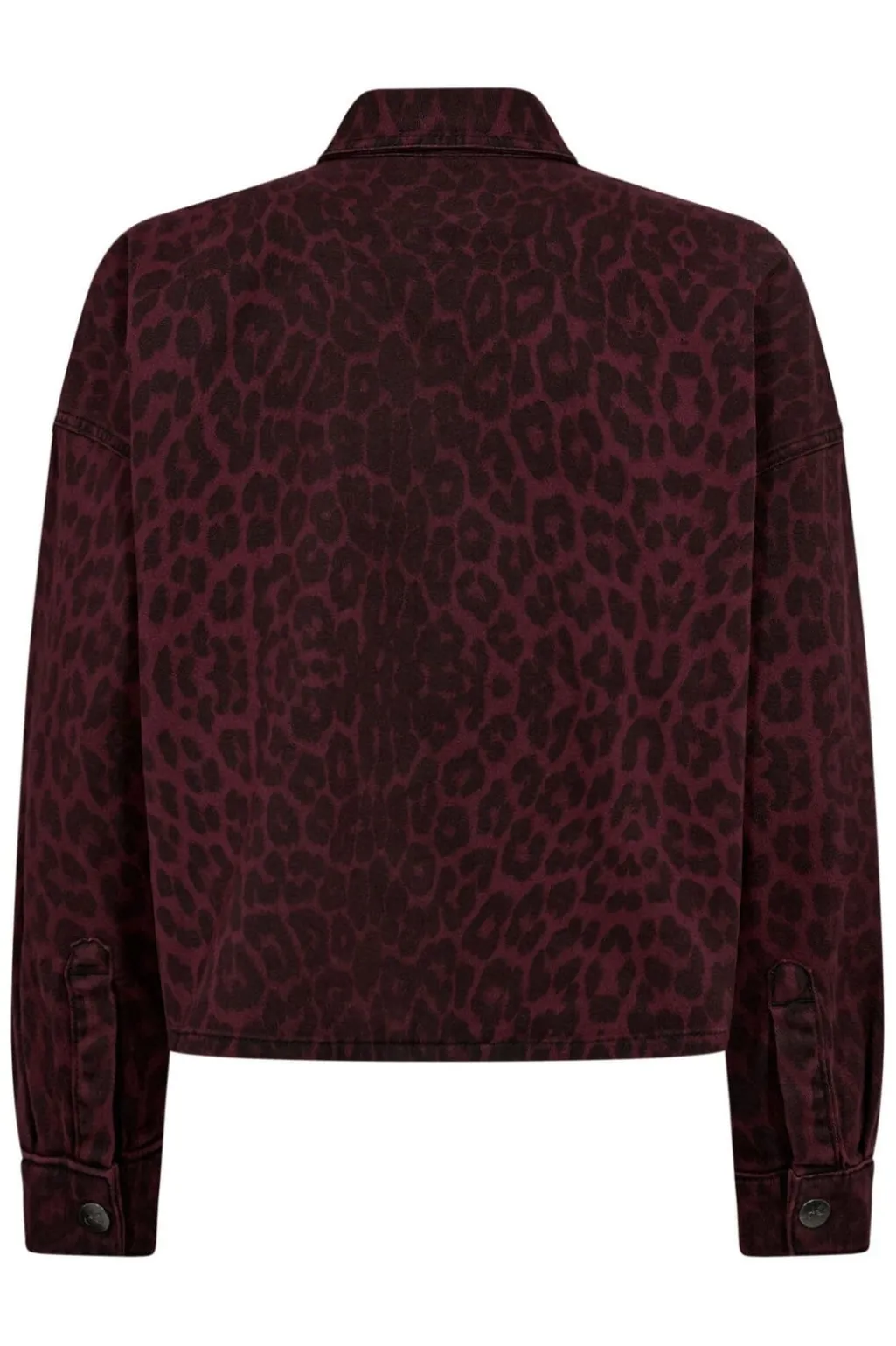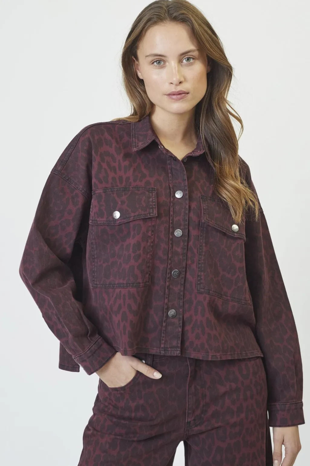 Denimskjorte i cropped længde med vinrødt leopardprint. To brystlommer med sølvfarvede knapper og skjortekrave giver skjorten et klassisk udtryk med et twist.