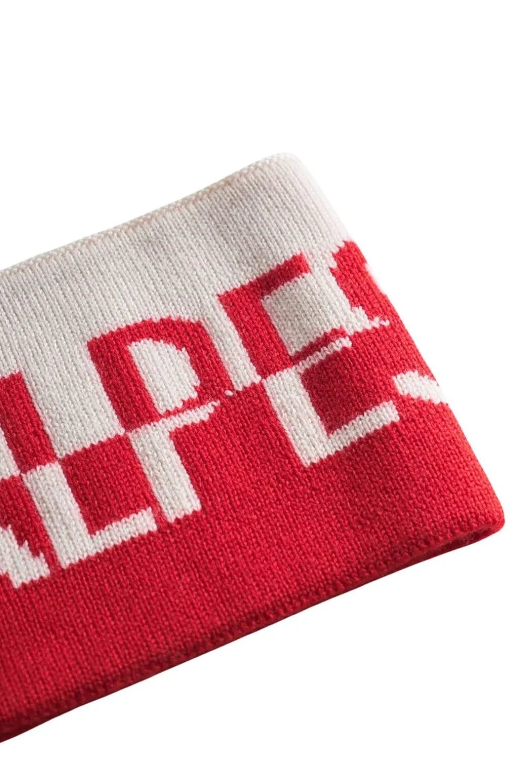 Pandebånd fra Twist & Tango i et tofarvet design med rød og hvid. Teksten LES ALPES er synlig på pandebåndet.