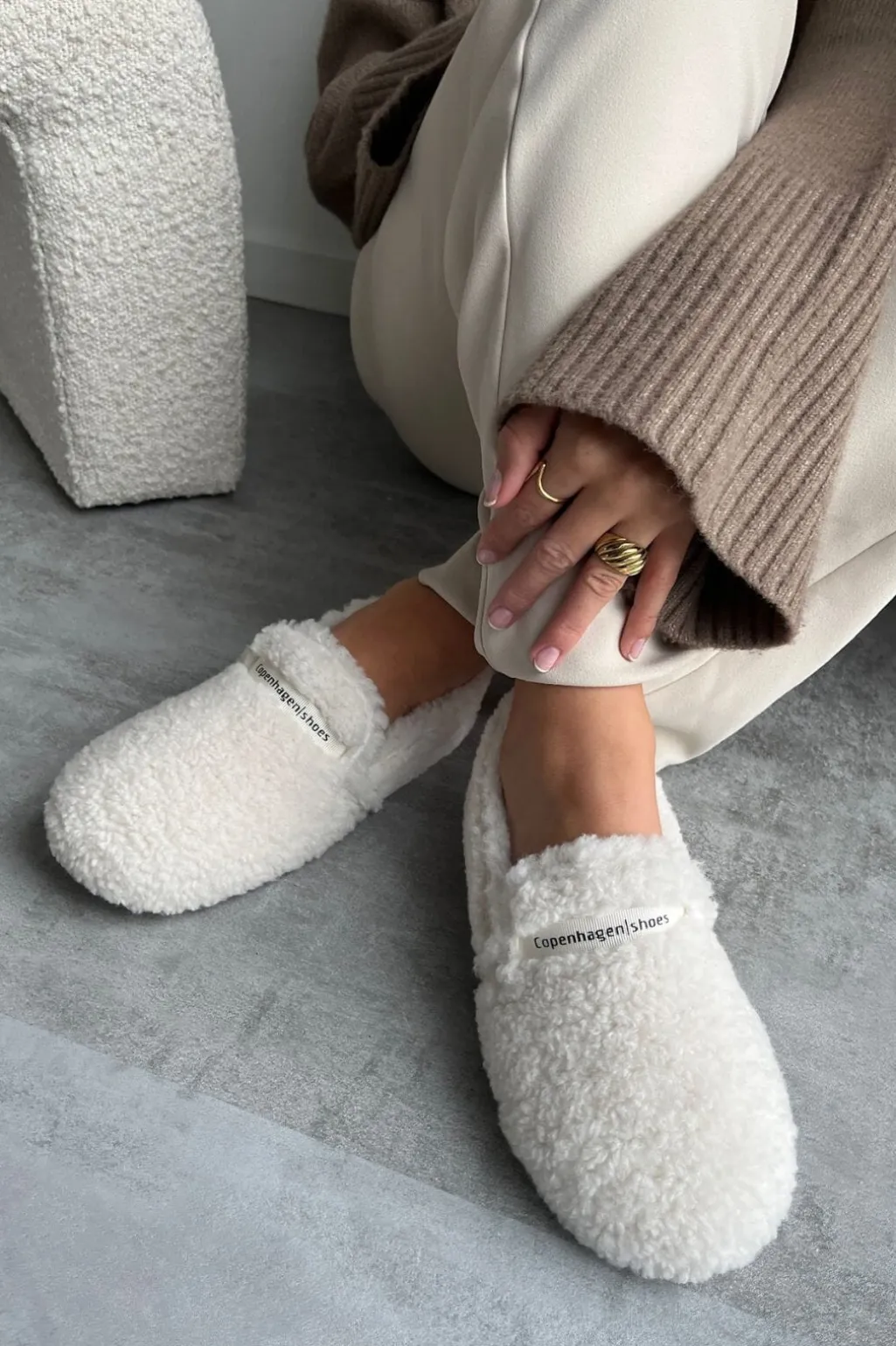 Hjemmesko fra Copenhagen Shoes i cremefarvet plys. Skoen har et blødt plysfor og fleksible gummisåler til indendørs brug.