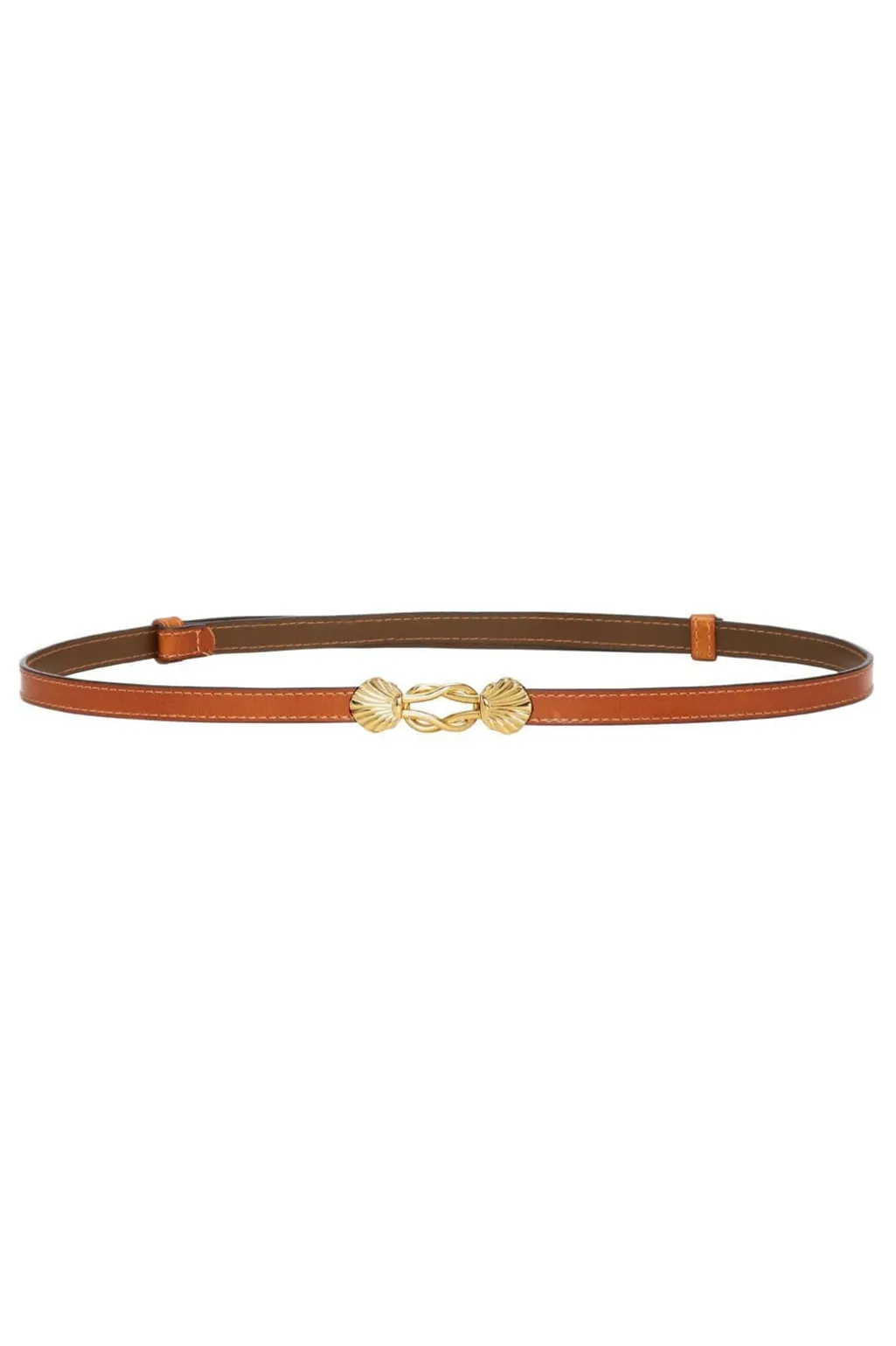 Slankt bælte fra Plissé Copenhagen i cognacfarve. Det tynde design har synlige kantsting og et guldfarvet spænde med muslingeskalmotiv.