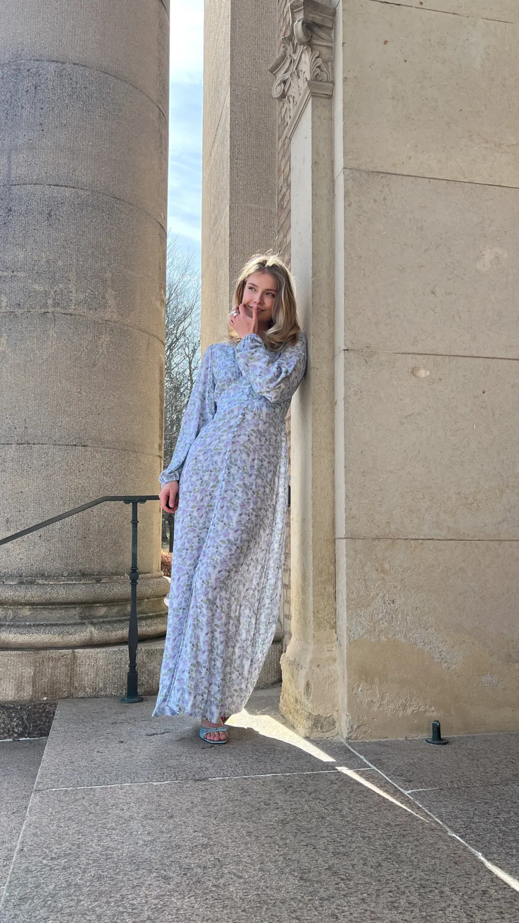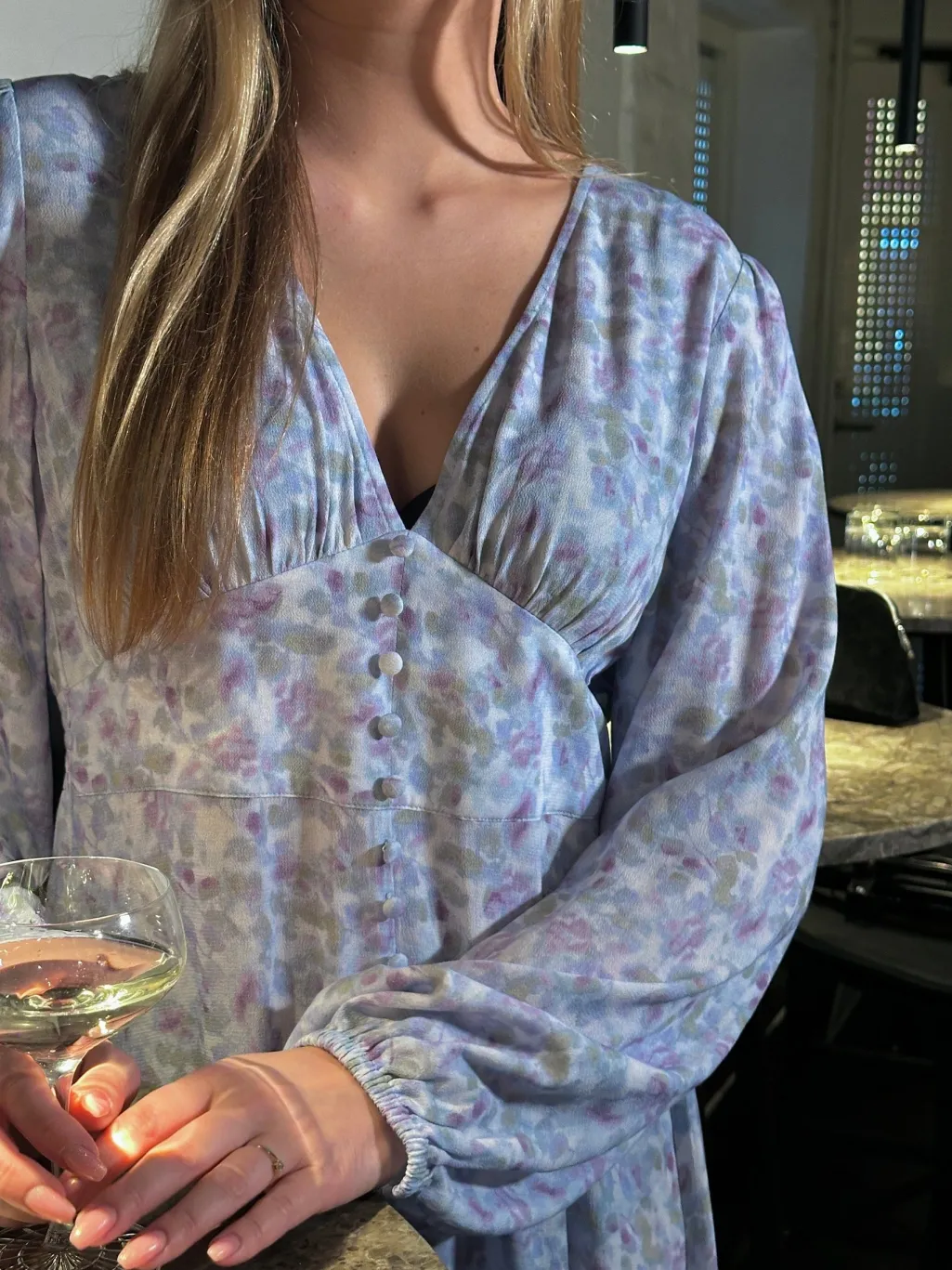 Maxikjole fra Noella i blå og lilla blomsterprint. V-udskæringen og den løse pasform giver god bevægelsesfrihed. De lange ærmer har manchetter, og kjolen lukkes med knapper foran.