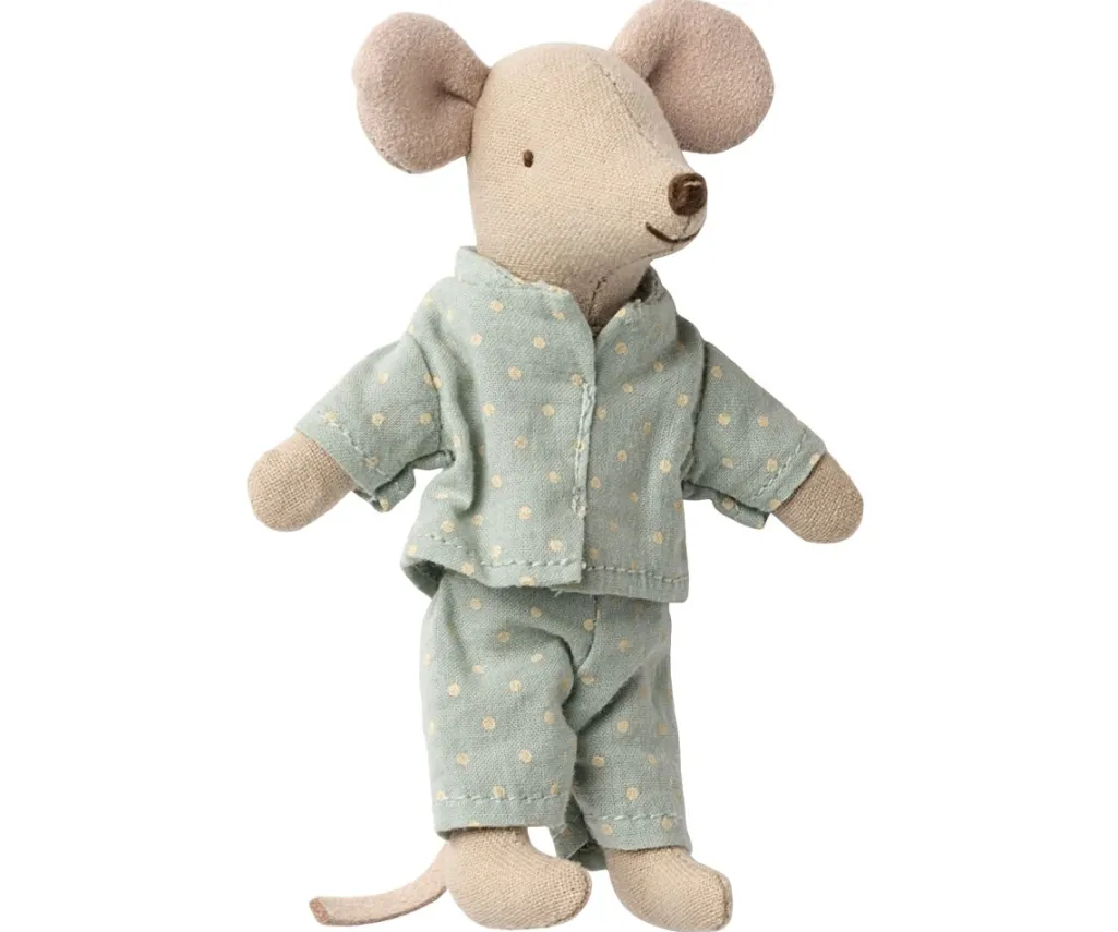 En musedukke fra Maileg i en tændstikæske med pyjamas i lyseblåt stof med hvide prikker og sengetøj i blødt stof.