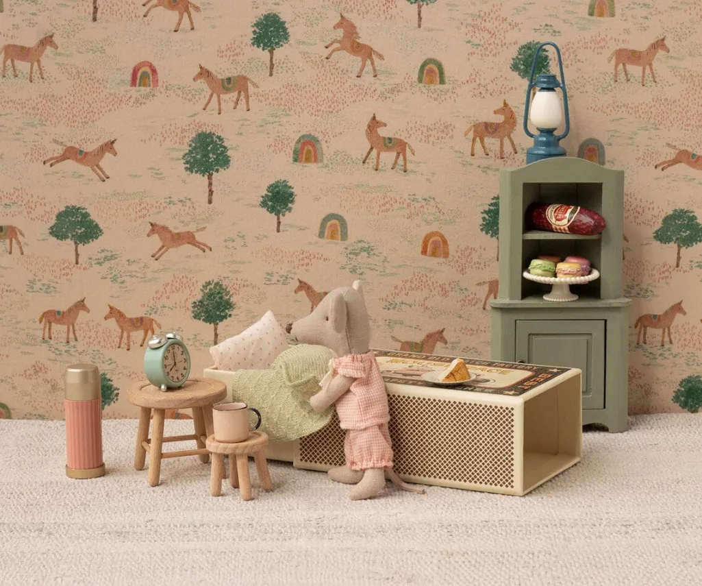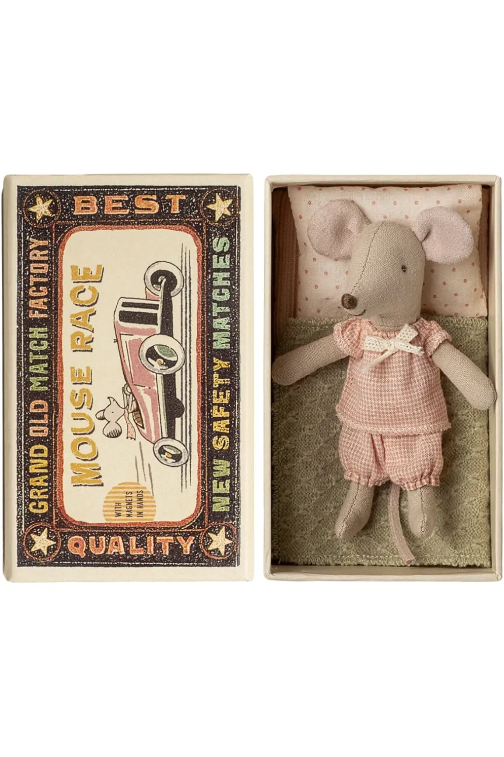 En lille muslegetøj fra Maileg, der kommer i en tændstikæske med vintage-design. Æsken fungerer som en seng til musen.