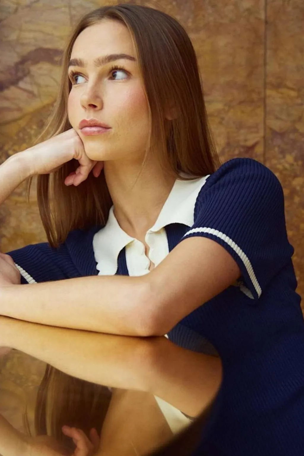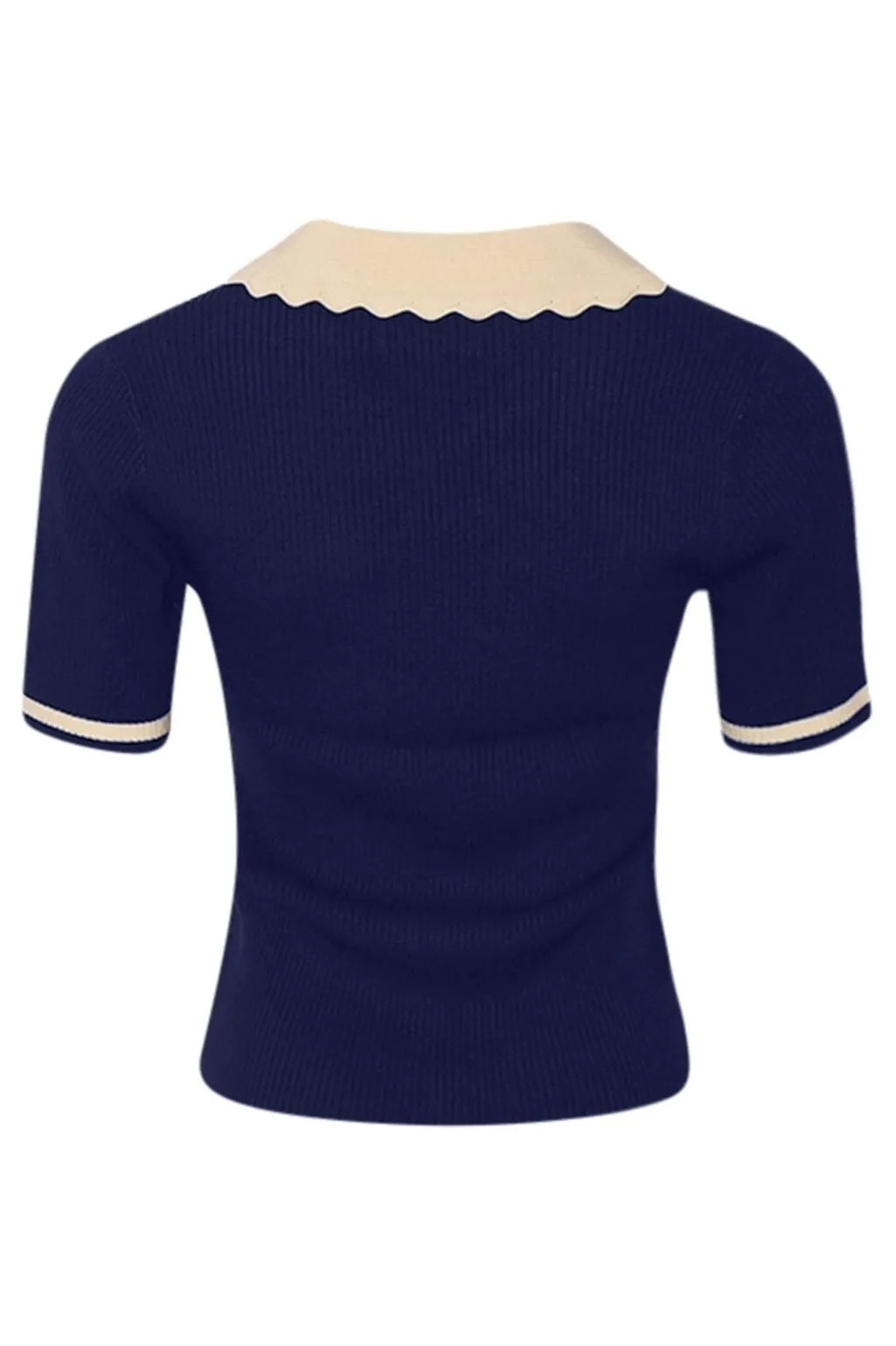 Kortærmet polo-strik fra Noella i mørkeblå farve med hvid krave. Lavet af 100 % viskose med en slim pasform.