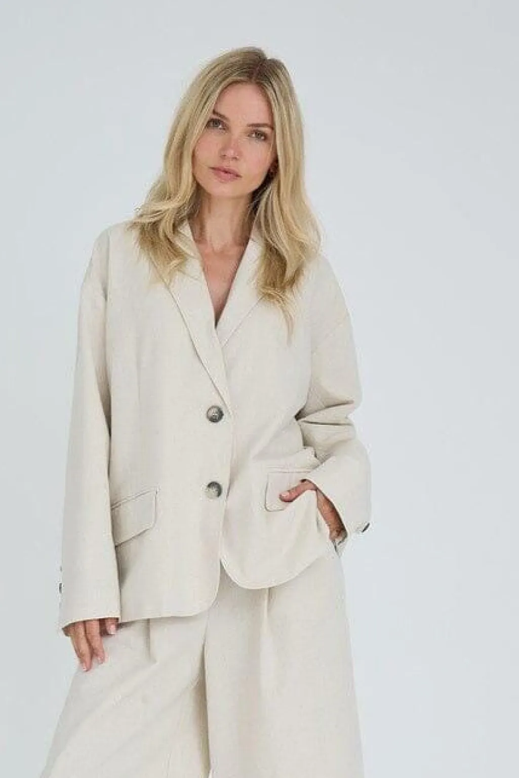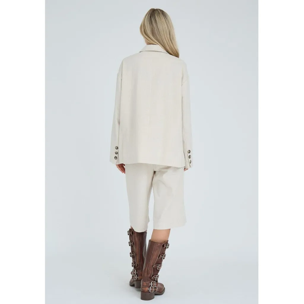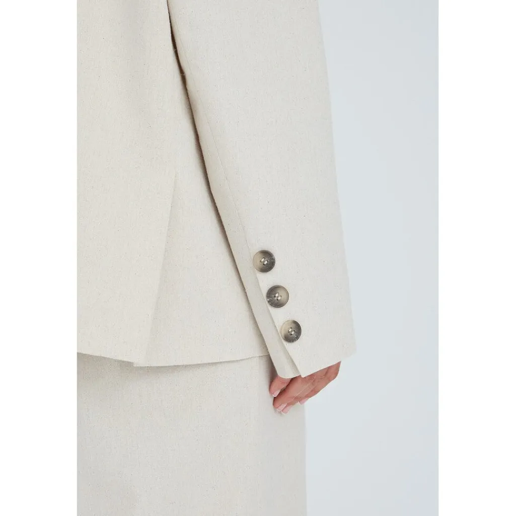 Sandfarvet blazer fra A-View, skabt af en blanding af bomuld, hør og polyester. Blazeren har en klassisk skræddersyet pasform med knapper foran og detaljer på ærmerne.
