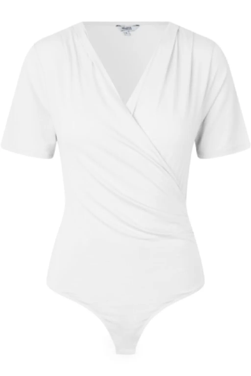Hvid bodysuit fra MbyM med omslagsdesign og korte ærmer. Bodysuiten har en V-halsudskæring og flæsedetaljer, der giver et blødt udtryk.