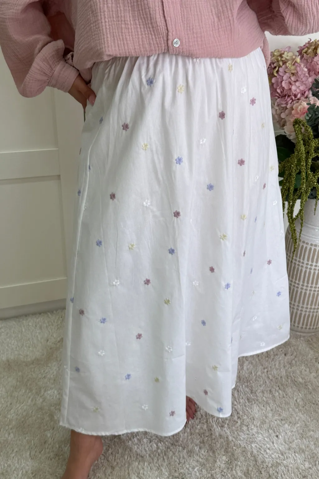 Hvid nederdel fra A-bee med broderede blomster i lilla, gul og rosa. Den har en løs pasform og kalvelængde, der gør den anvendelig til både hverdag og fest.