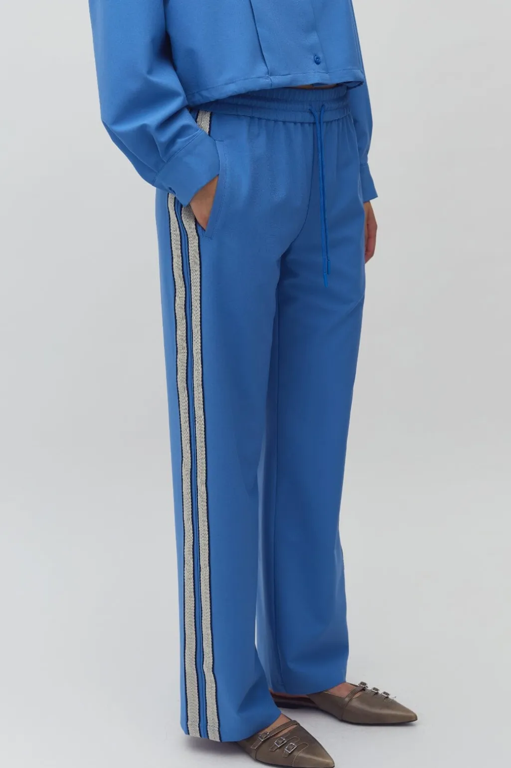 Blå bukser fra MbyM med vide ben og ankellængde. Bukserne har striber langs siden og en elastisk talje med snørelukning.