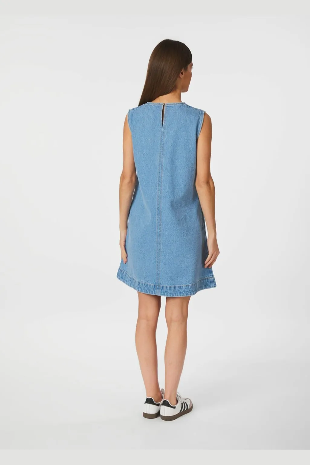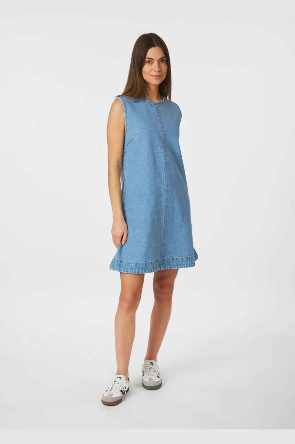 Denimkjole fra Neo Noir i lys blå. En ærmeløs kjole med rund hals og løs pasform. Dekorative syninger og skjulte lommer giver kjolen et praktisk og stilrent udtryk.