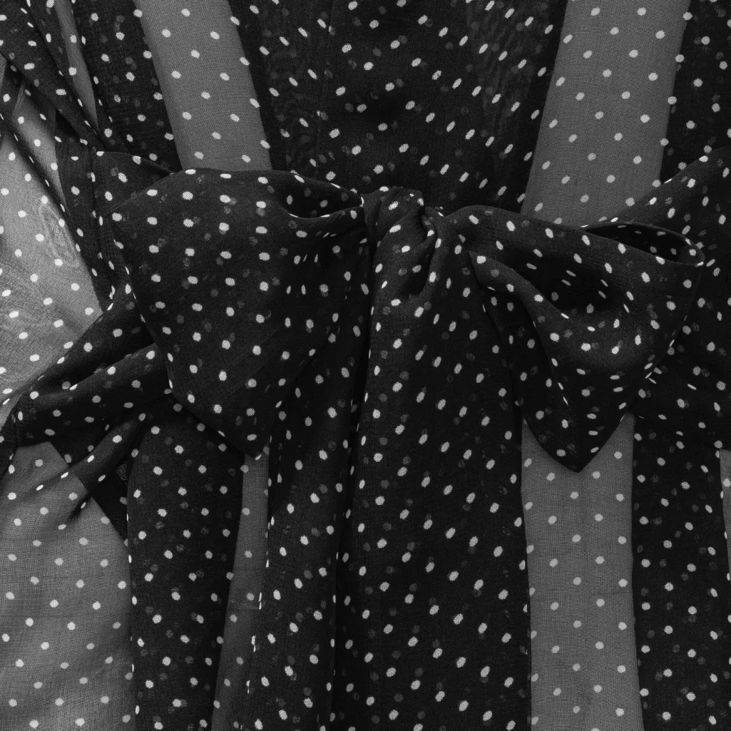 Sort wrap-bluse fra Karmamia med hvide prikker. Blusen er lavet af gennemsigtigt meshmateriale i 100 % polyester og har bindebånd til lukning.