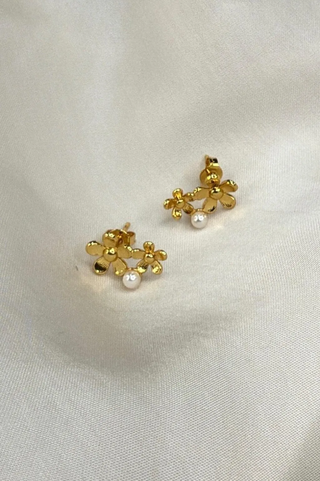 Forgyldte ørestikker fra Molly&My Jewellery med to små blomster i guld og en hvid perle på hver ørestik.