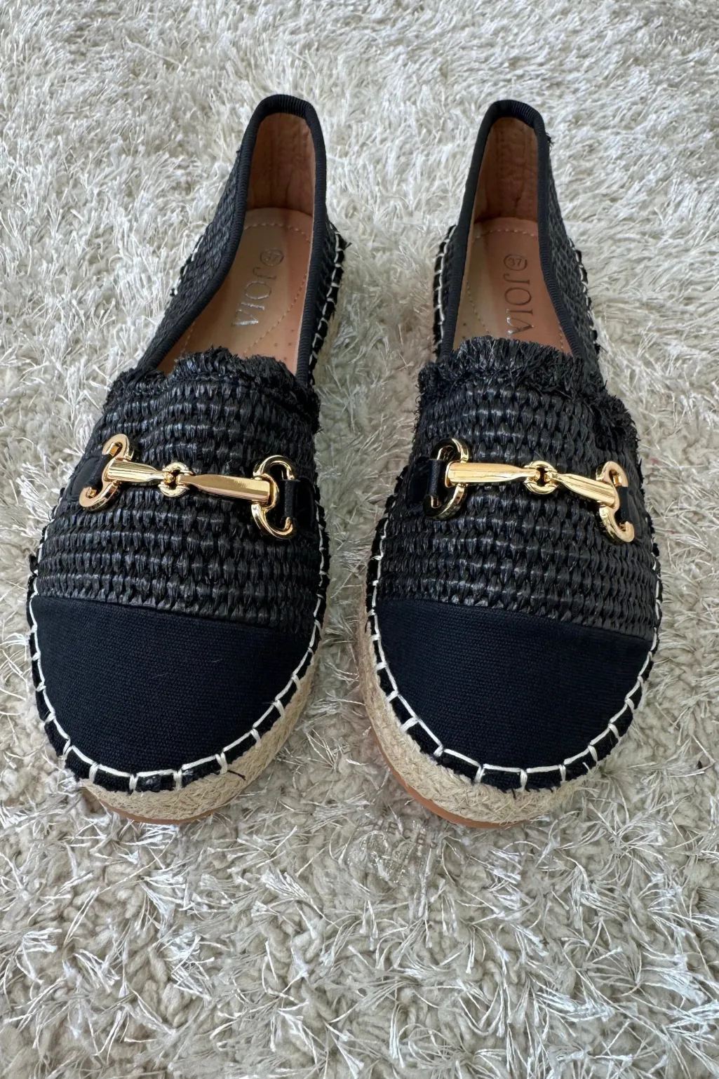 Sort espadrille fra Bloom med vævet overdel og guldfarvet spænde. Skoen har en flad sål med hvide syninger langs kanten og en rund tå.