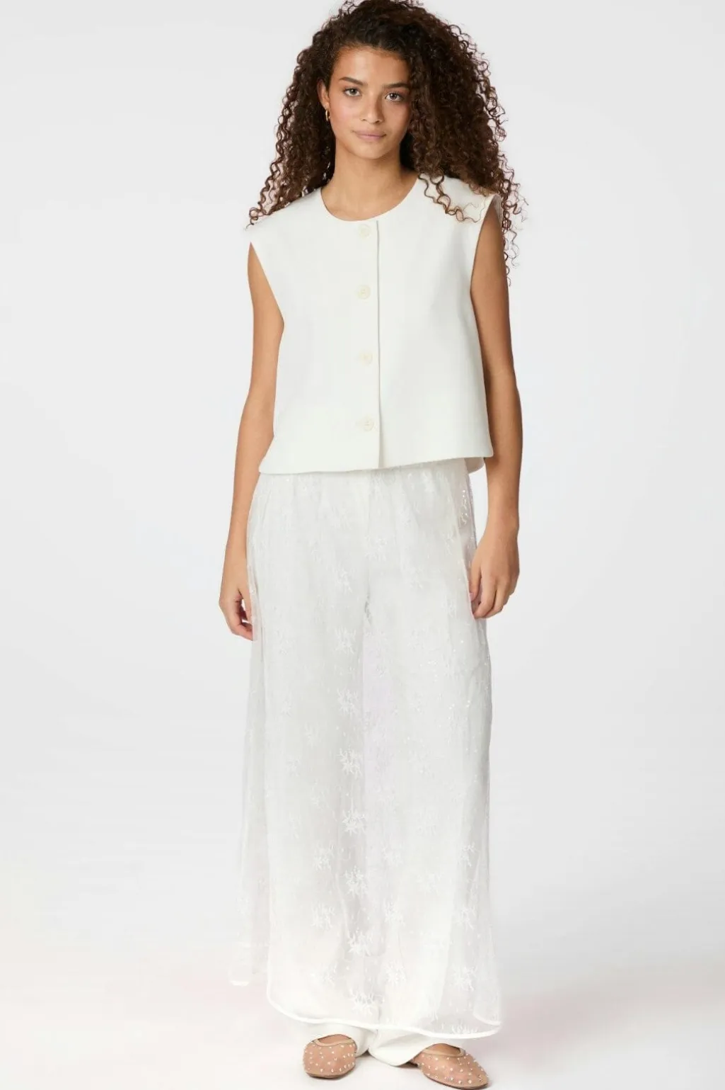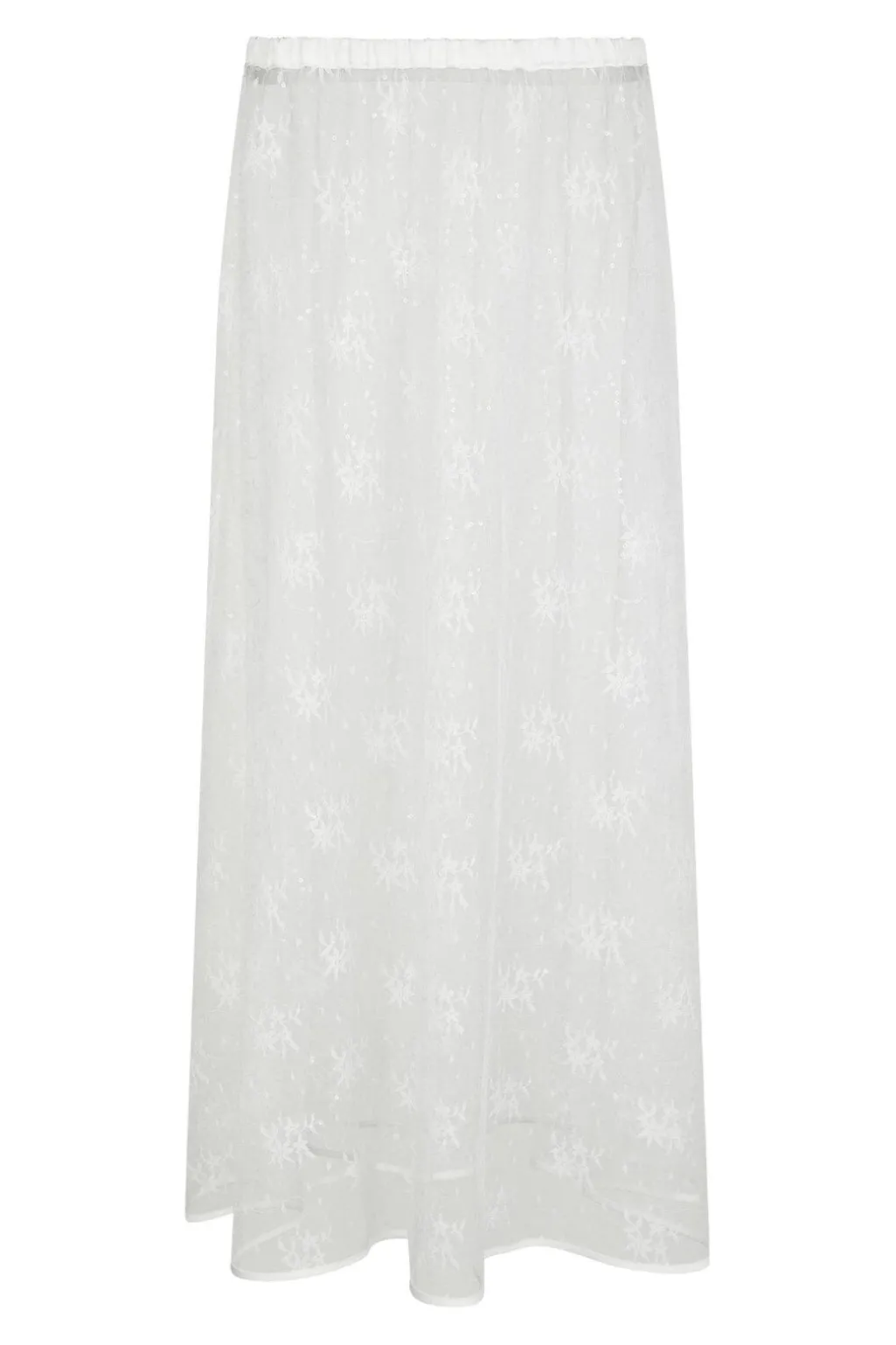 Hvid nederdel fra Neo Noir med blondemønster og pailletter. Den gennemsigtige nederdel har et blomstermønster og går til anklerne.