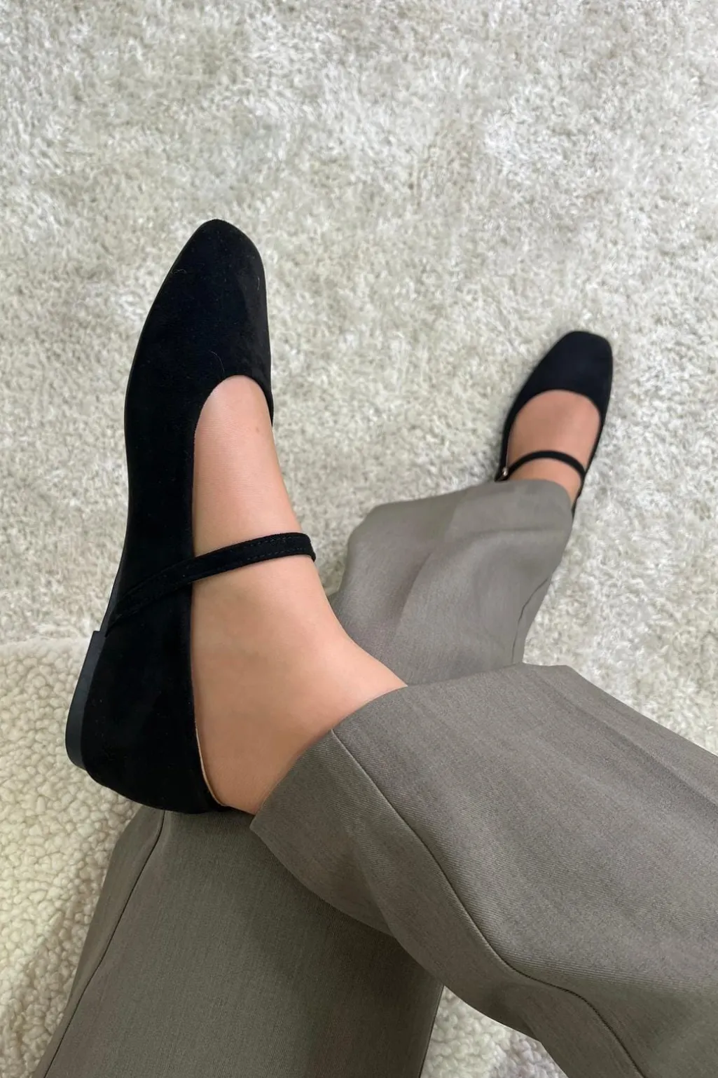 Sorte ballerinaer fra Bloom med mandelformet tå og rem over vristen. Skoene er fremstillet i syntetisk materiale med en lav hæl og spændelukning.