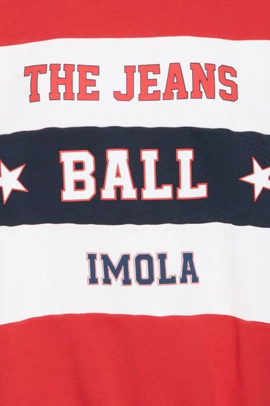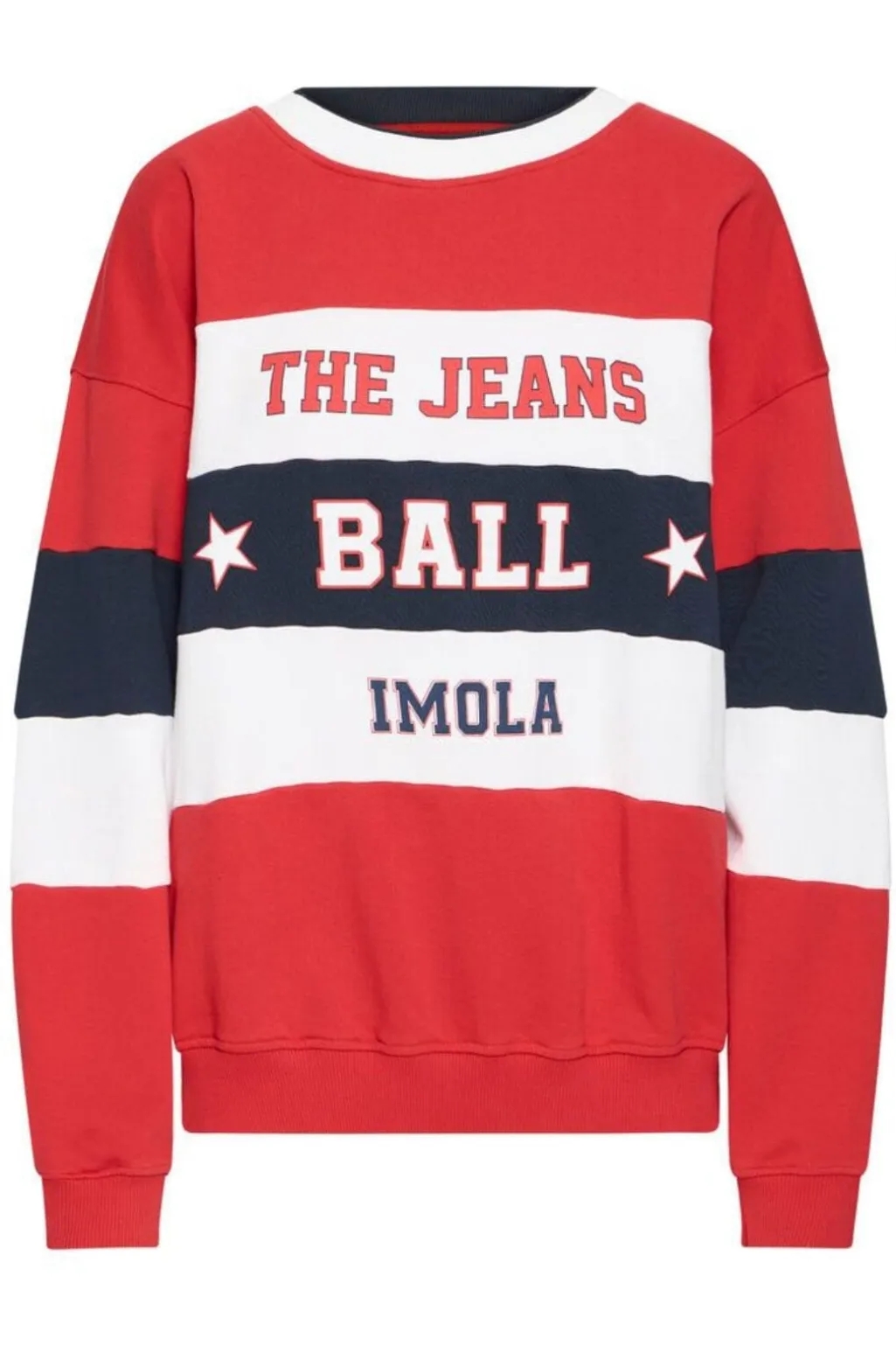 Sweatshirt fra Ball med horisontale striber i rød, hvid og mørkeblå. Designet har Ball-logoet på forsiden sammen med tekst og stjerner.