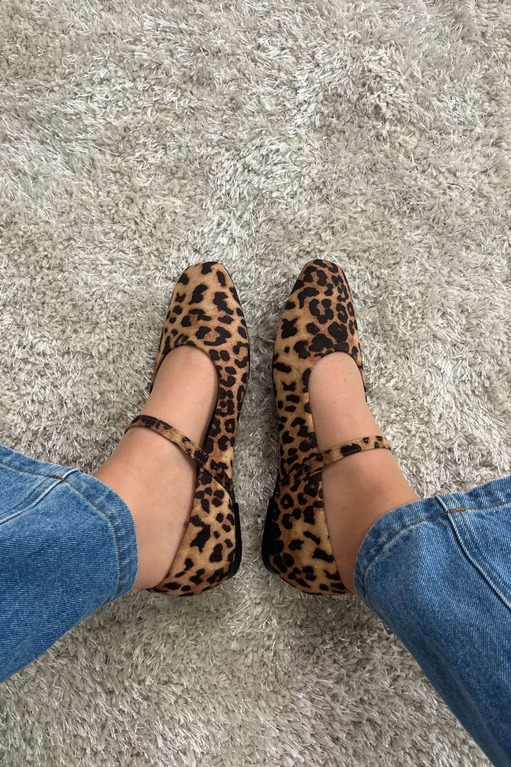 Ballerina fra Bloom med leopardprint i brune og sorte nuancer. Skoen har mandeltå og en praktisk spænderem over vristen.
