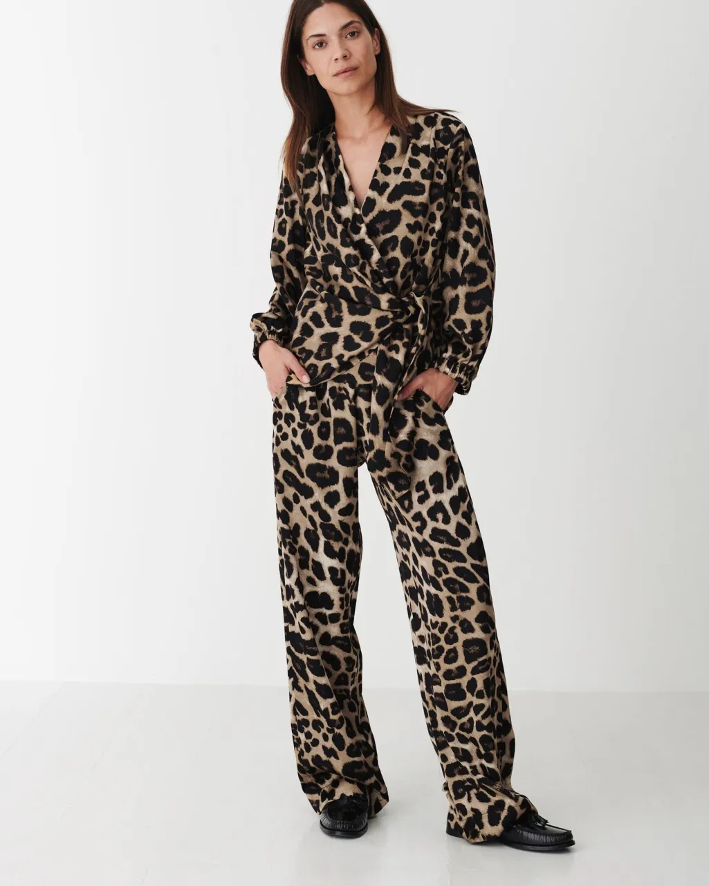 Bukser fra Karmamia med brun-beige leopardmønster og hammeret tekstur. Bukserne har en bred benåbning og elastisk talje med snøre til justering.