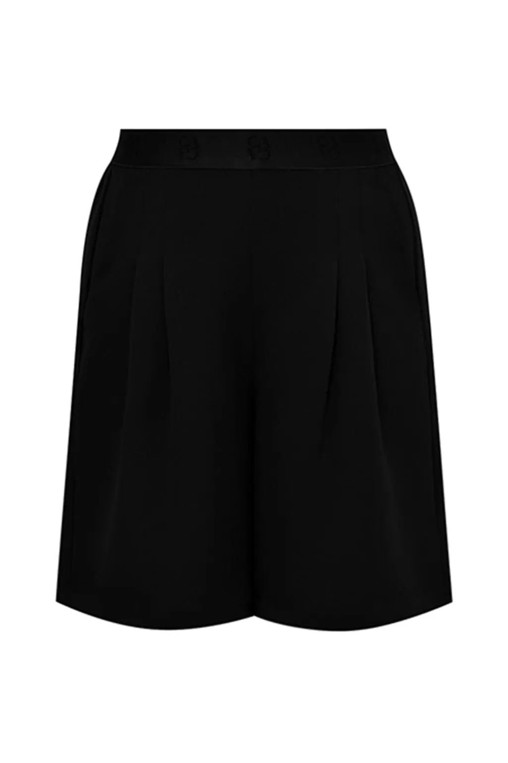 Sorte shorts fra Gossia med plisseret front og logo på taljen. Shortsene har en klassisk lårkort længde og en ensfarvet sort overflade.
