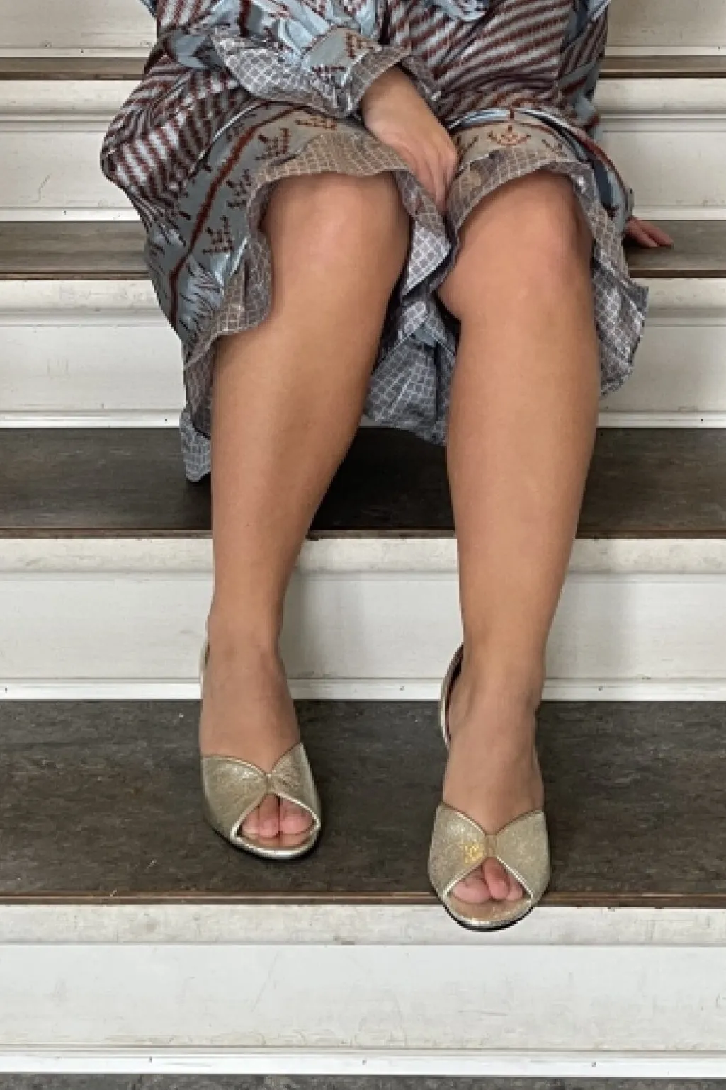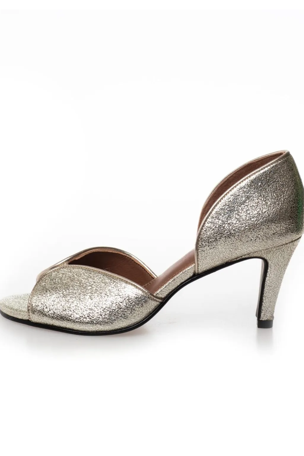 Festsko i skind med metallisk Platino-finish. Skoene har åben tå og stilethæl. Den bløde latexindersål giver god støtte under foden.