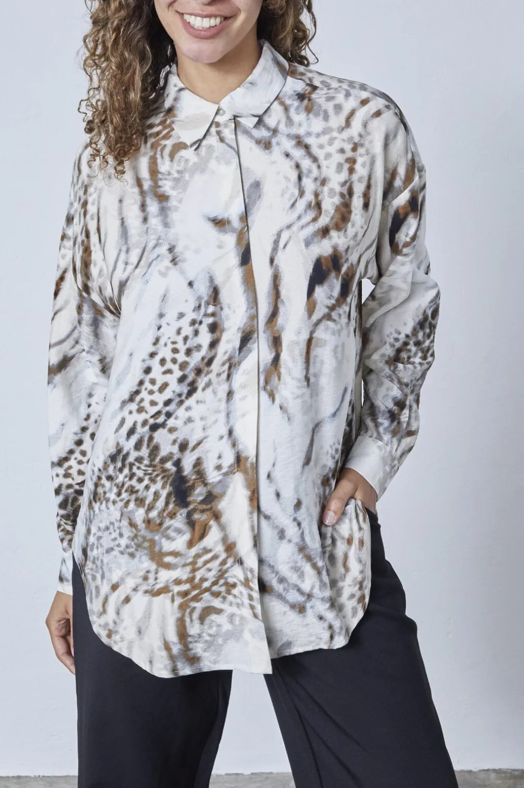 Skjorte fra Love & Divine i creme og brun med dyreprint. Skjorten har en klassisk krave og lange ærmer med manchetter.