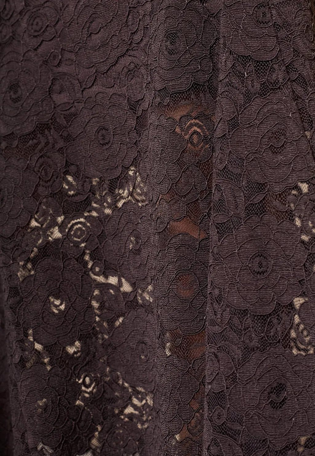Brun blondenederdel fra Love & Divine. Nederdelen har et blomstret blondemønster og går til midt på læggen. Stoffet er let gennemsigtigt og har en A-form.