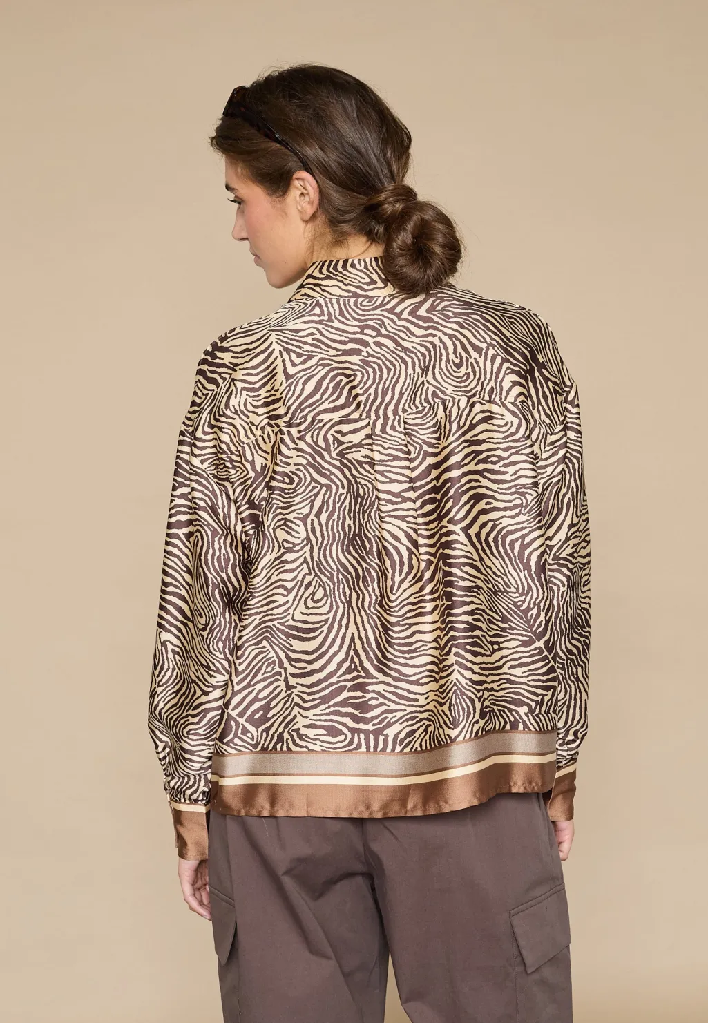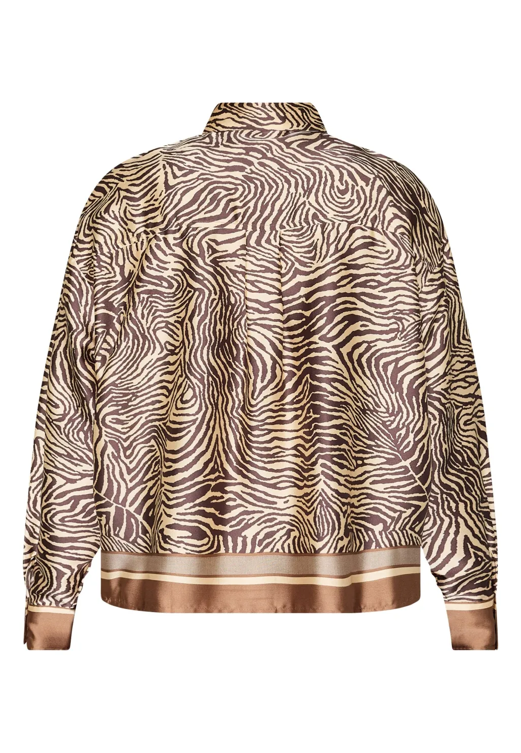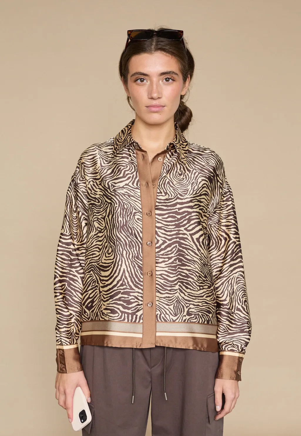 Skjorte fra Love & Divine i 100 % polyester med brunt zebra-mønster. Skjorten har skjortekrave, lange ærmer og en oversized pasform med knaplukning foran.