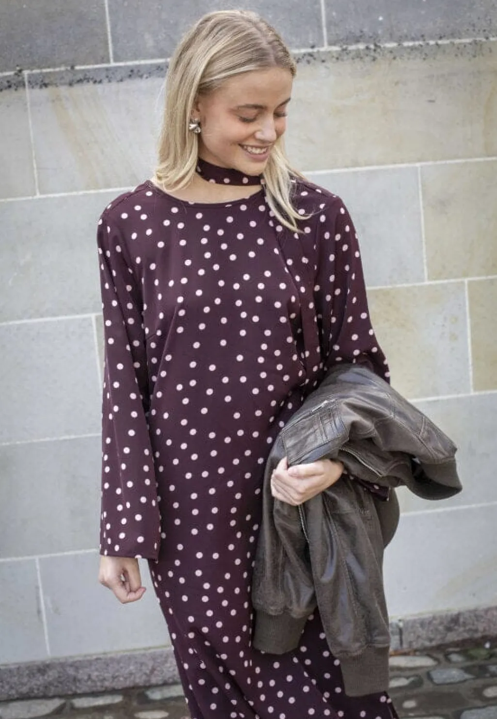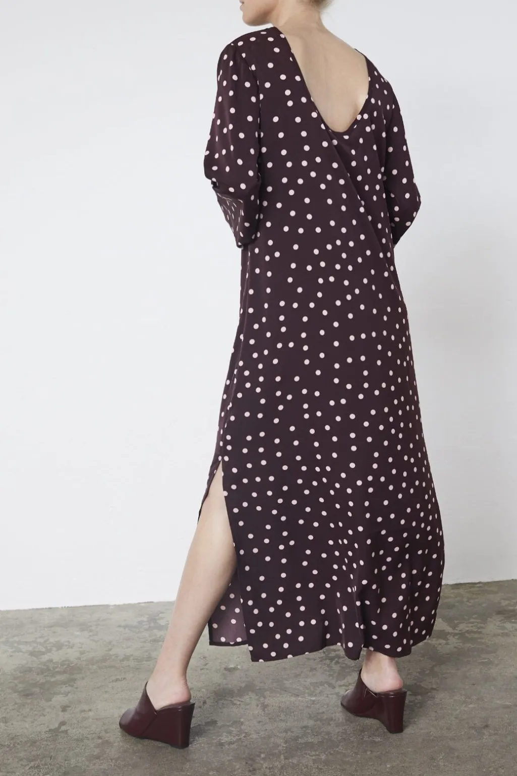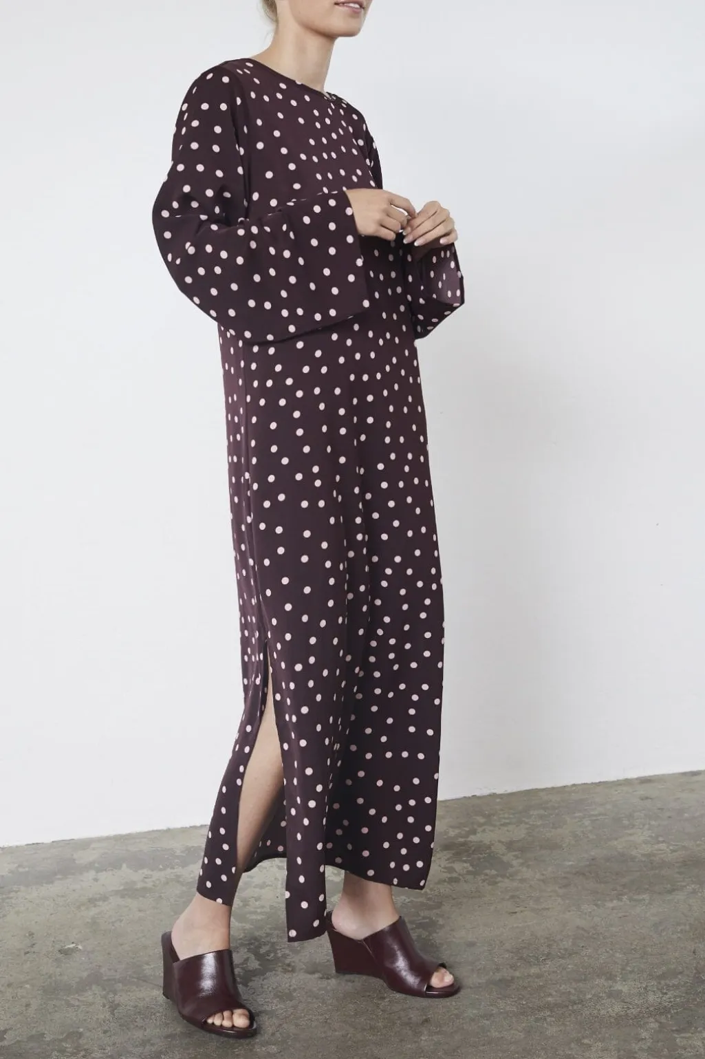 Langærmet kjole fra Love & Divine i bordeaux med lyse polkaprikker. Den lange kjole har en rund halsudskæring og en løs pasform med slids i siden.