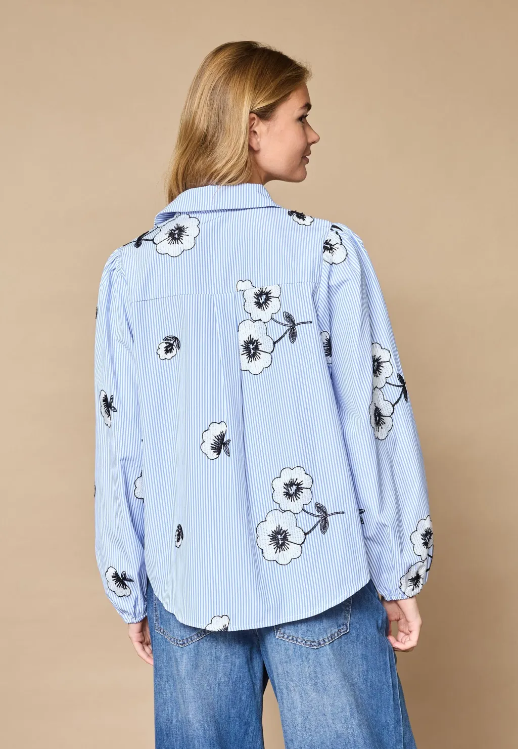 Skjorte fra Love & Divine med broderede blomster på en stribet baggrund i lyseblå og hvid. Skjorten har lange ærmer og en løs pasform.