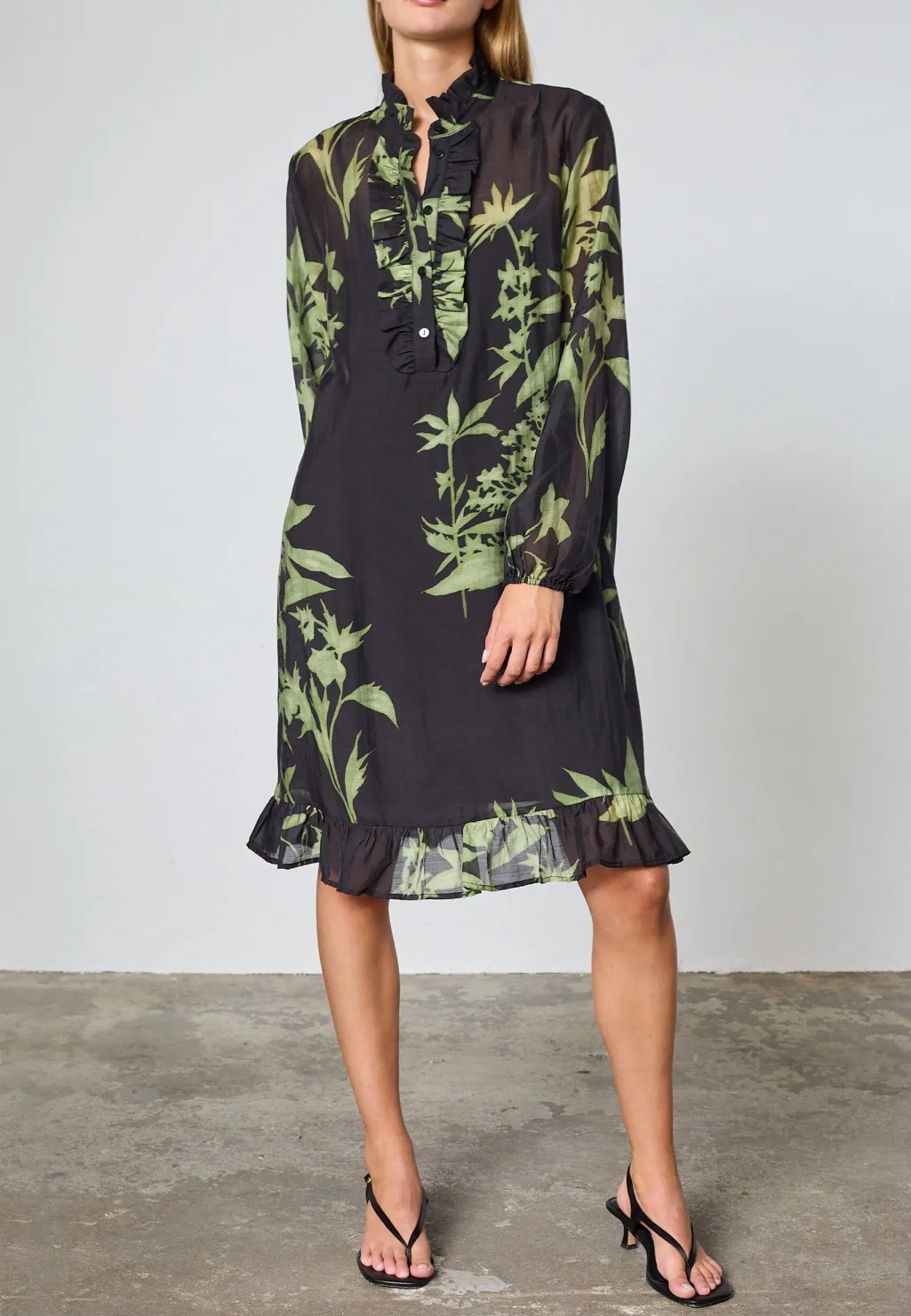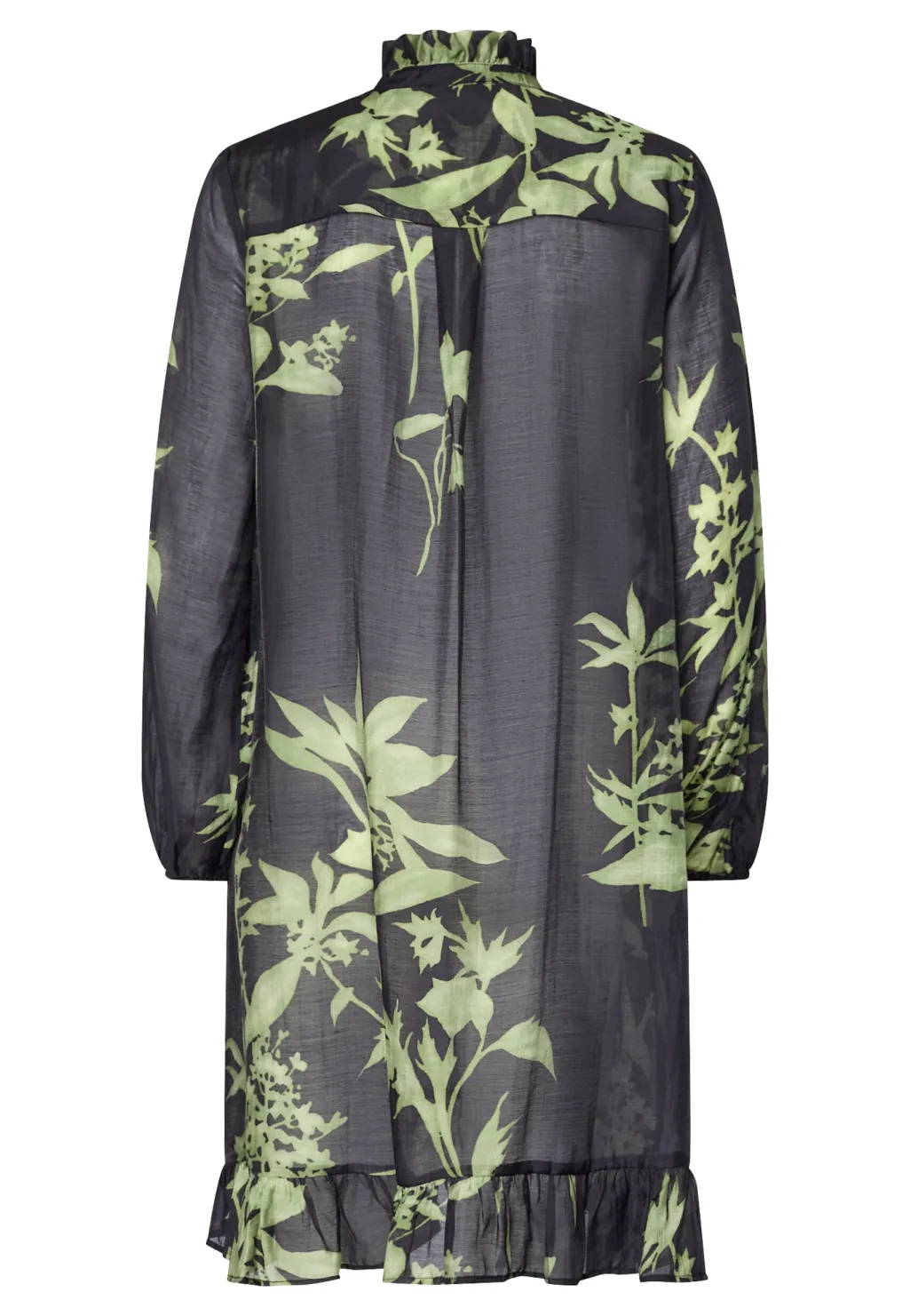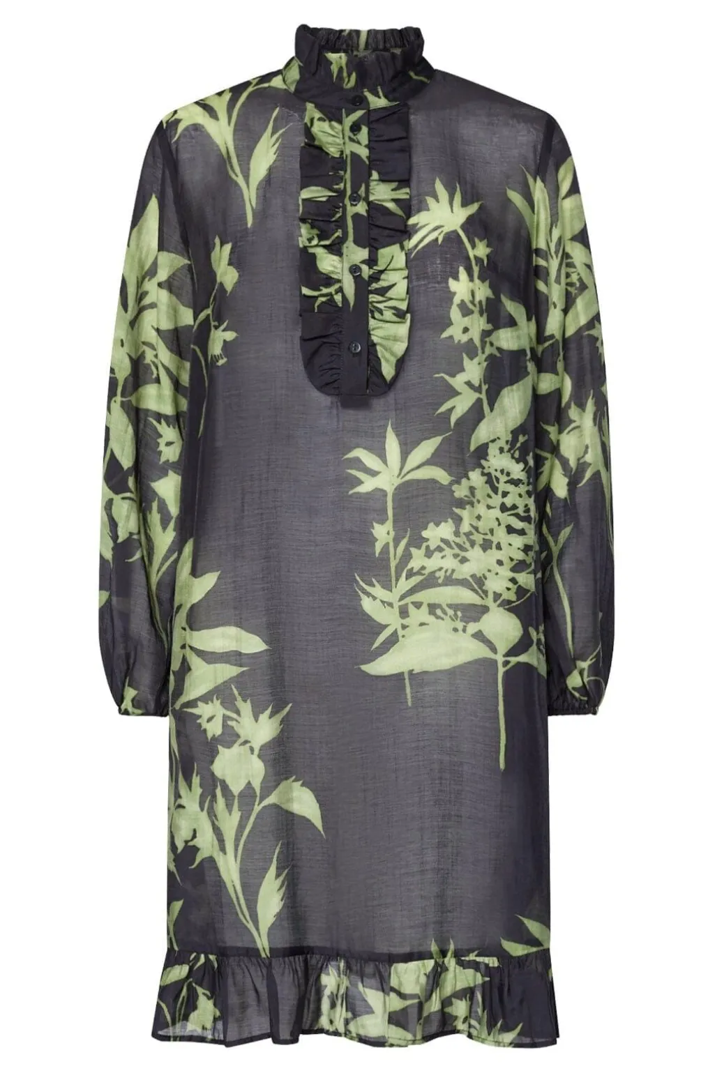Knælang kjole fra Love & Divine med grønt bladmønster på mørk baggrund. Kjolen har en lille stående krave med flæser og lukkes med knapper.