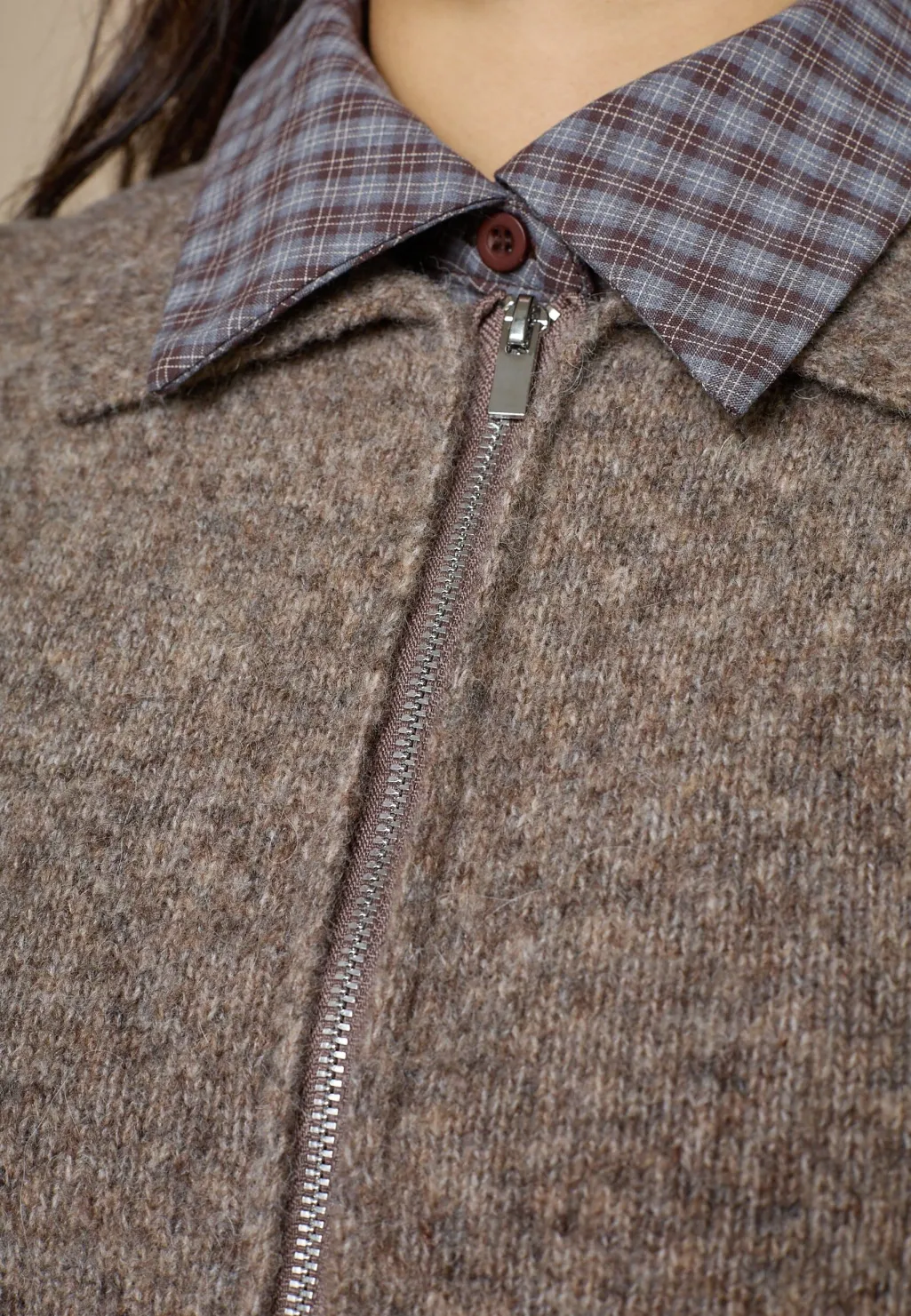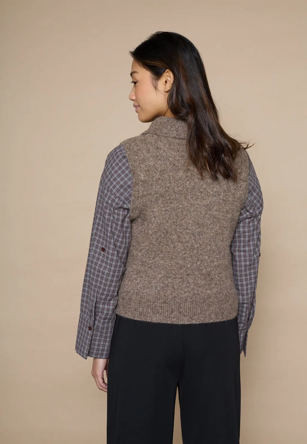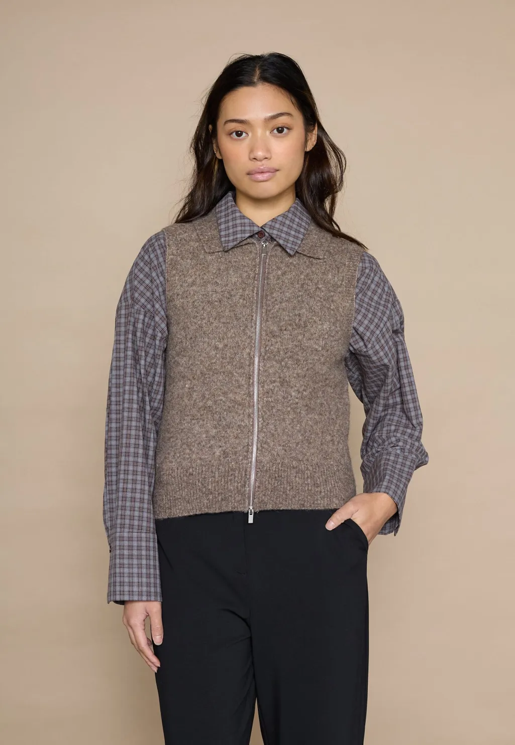 Ærmeløs strikvest fra Love & Divine i brun meleret farve. Vesten har en polokrave og fuldlængde lynlås i front.